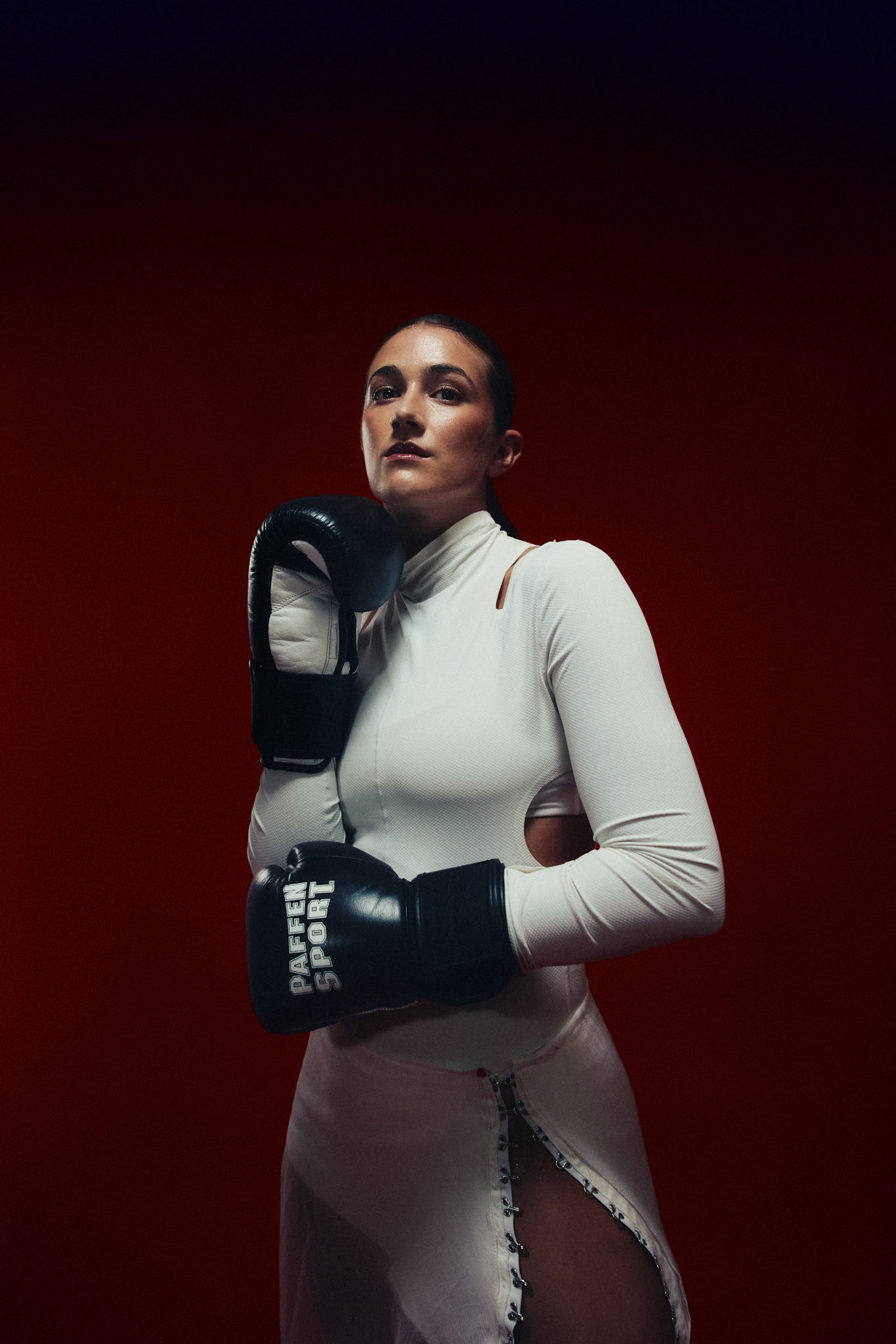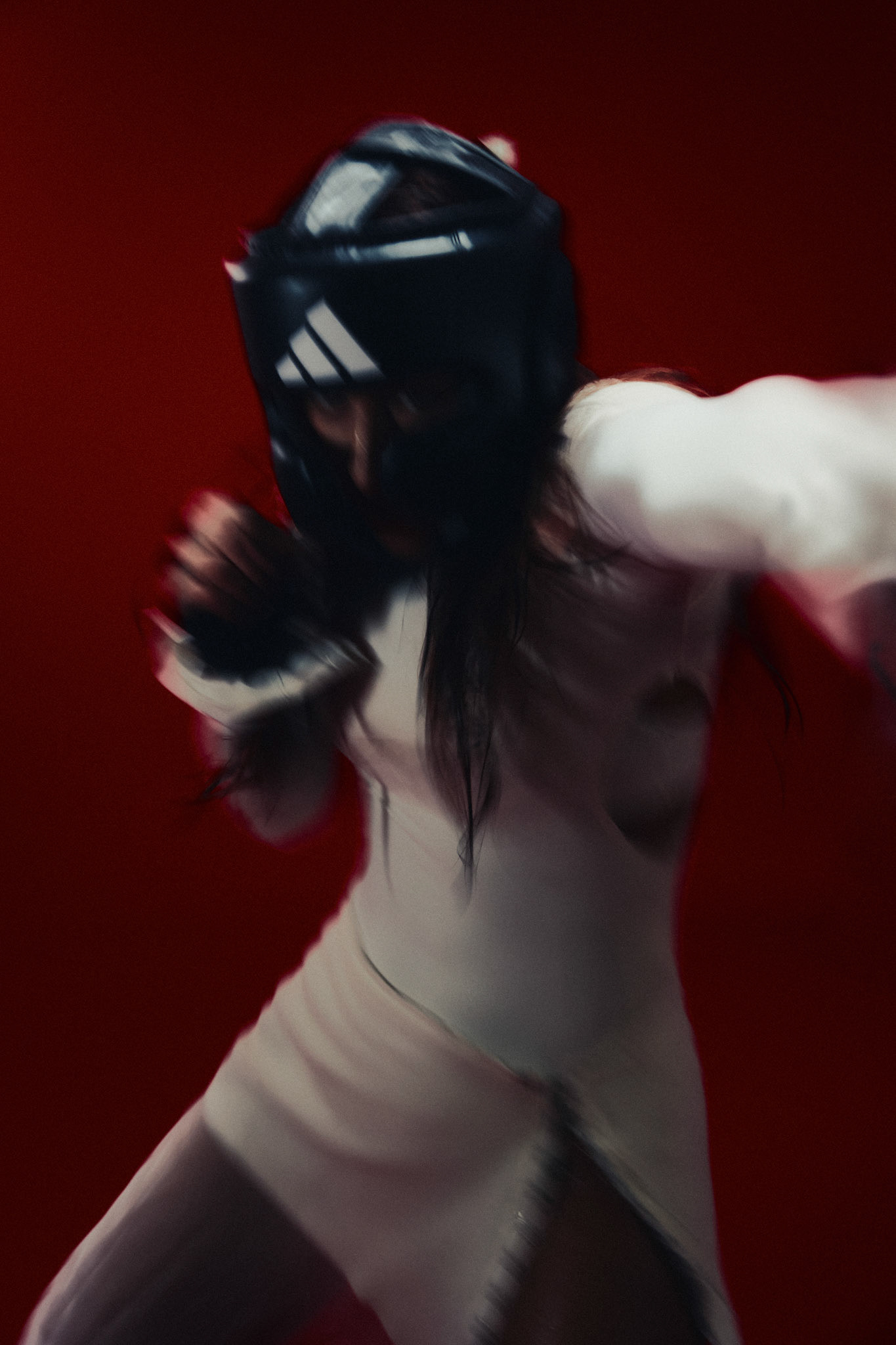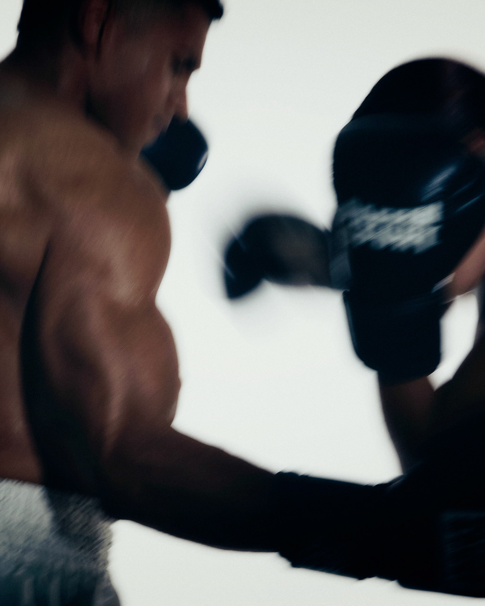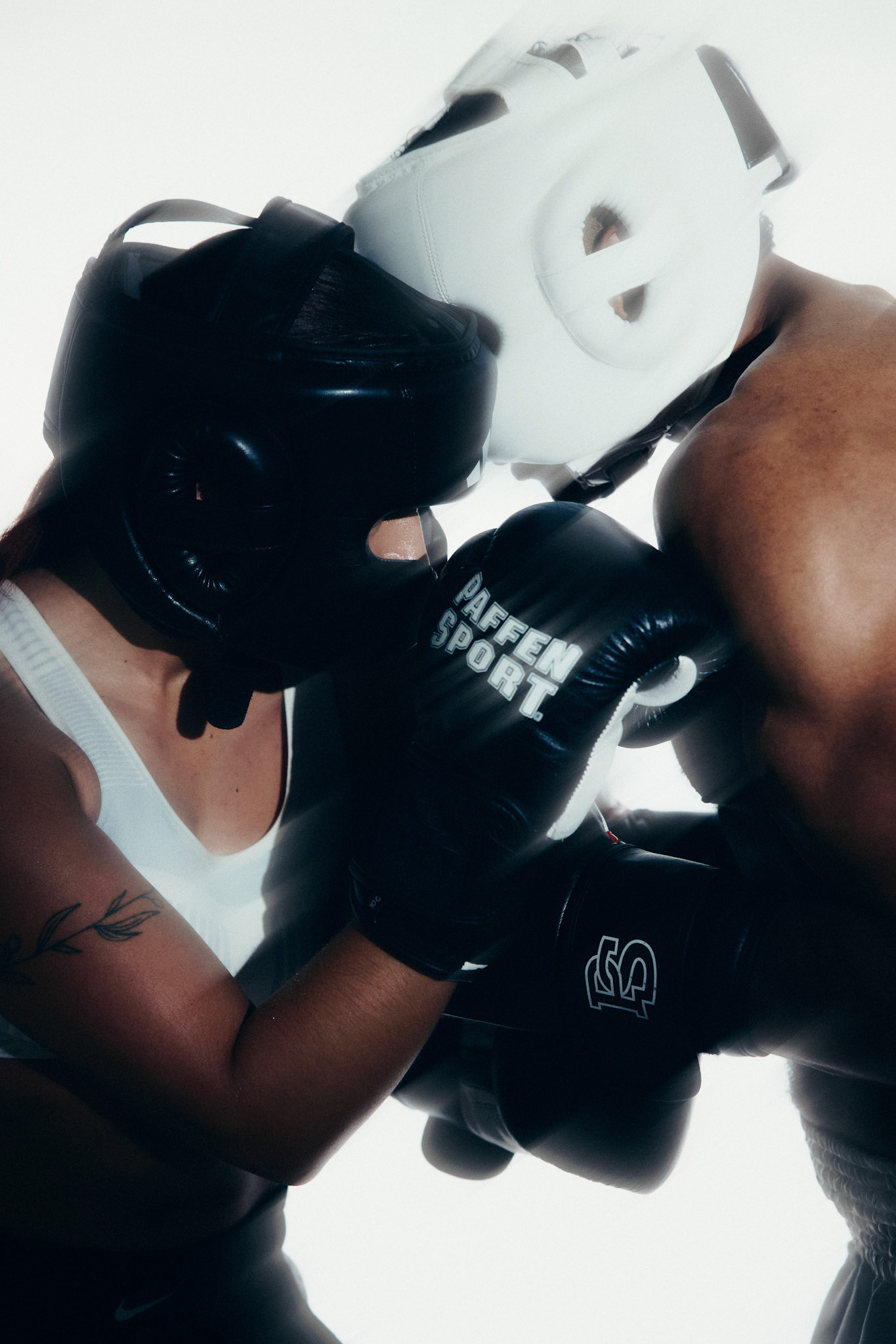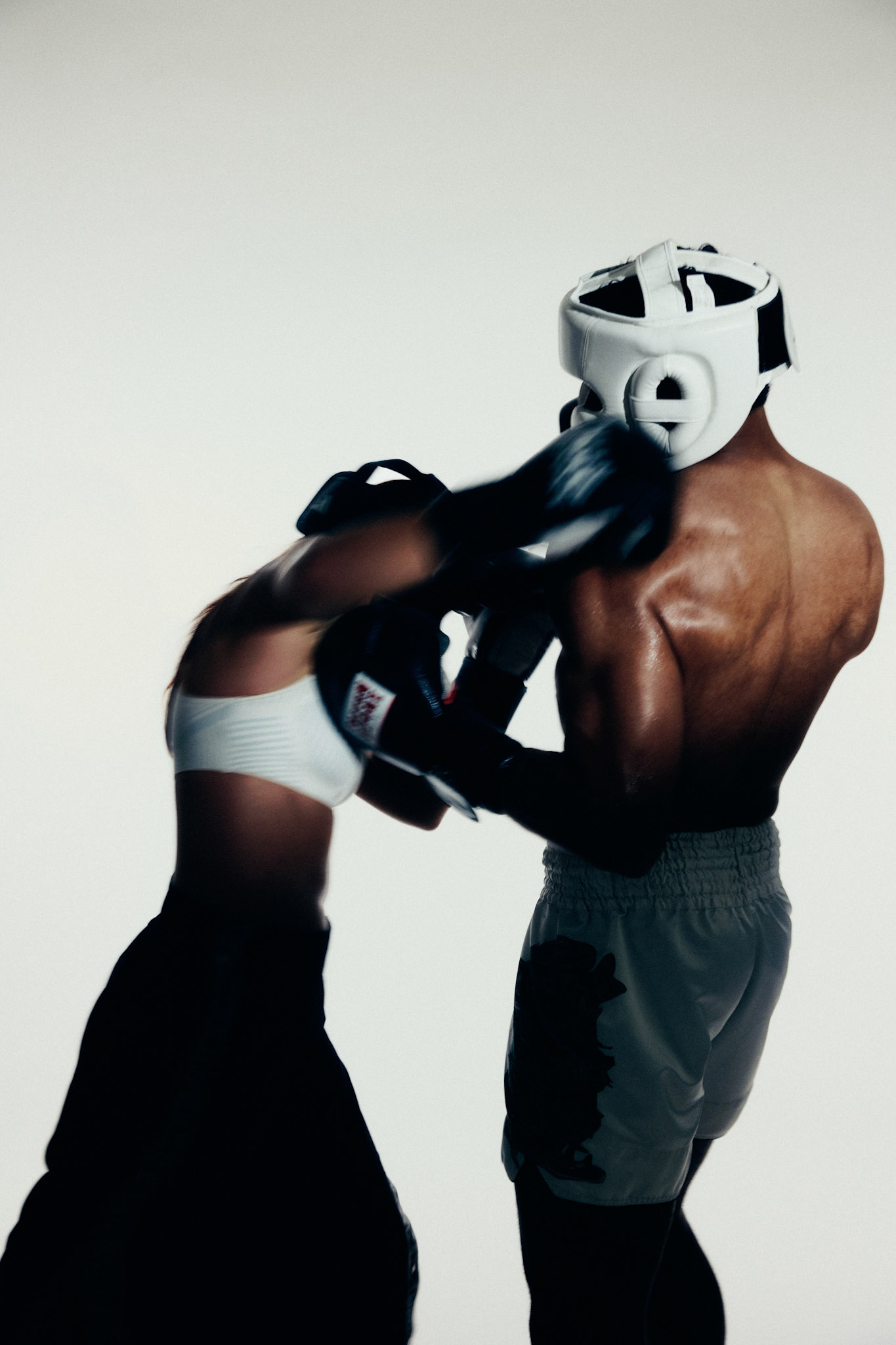 request for editorial: Sport, training, winning, duo, motion, chic, contrasts, color palette: Black - white - grey -burgundy - red, mood: Boxing.