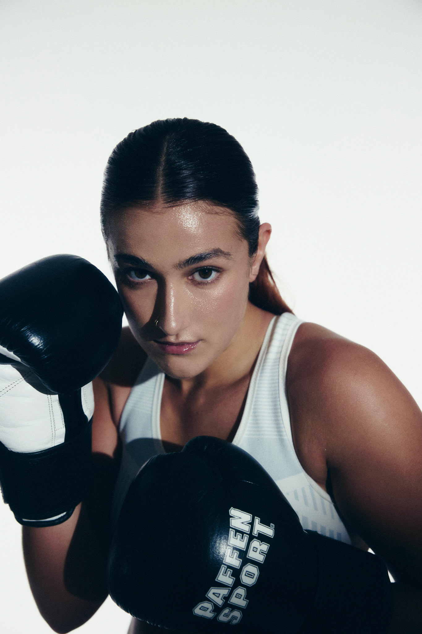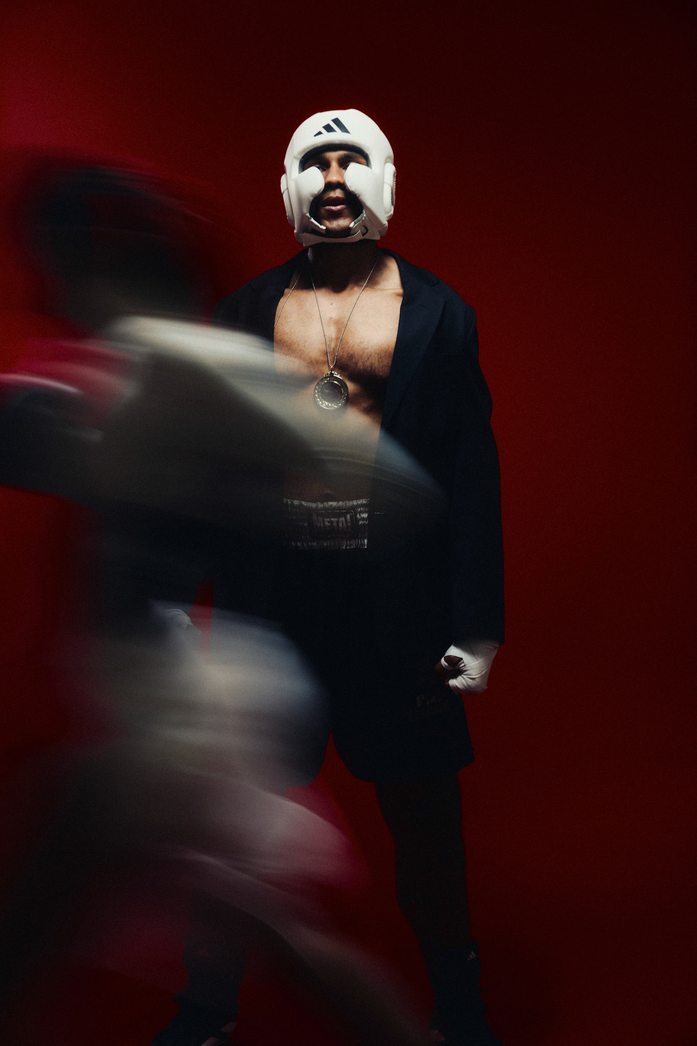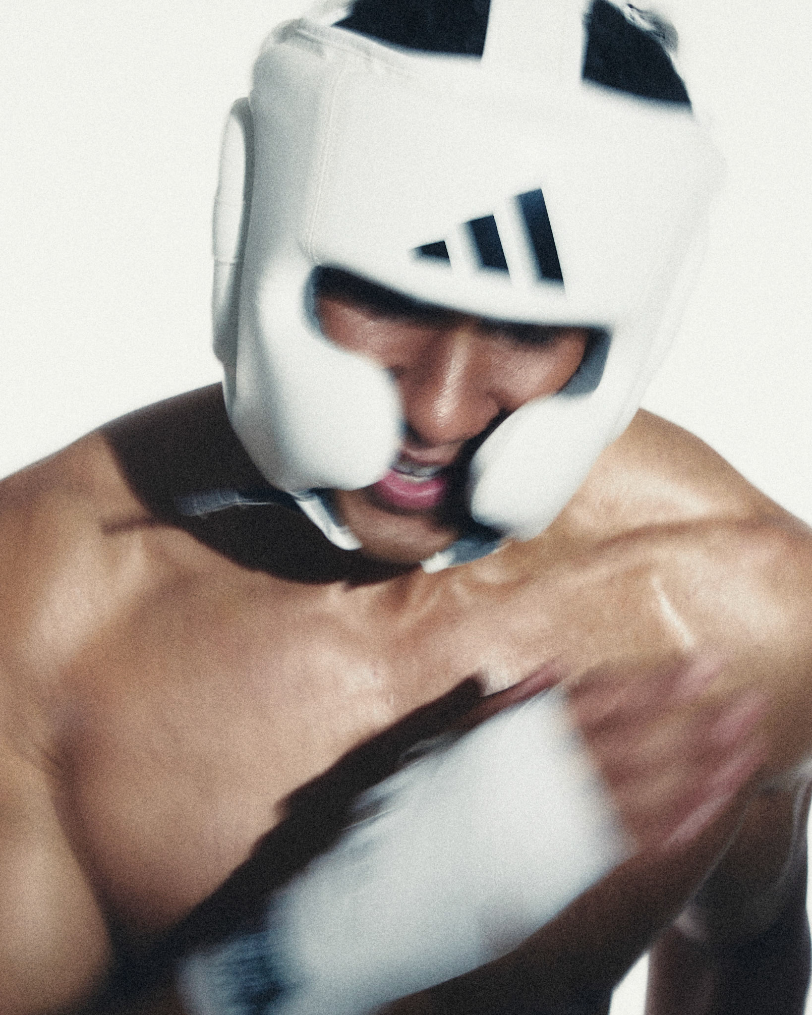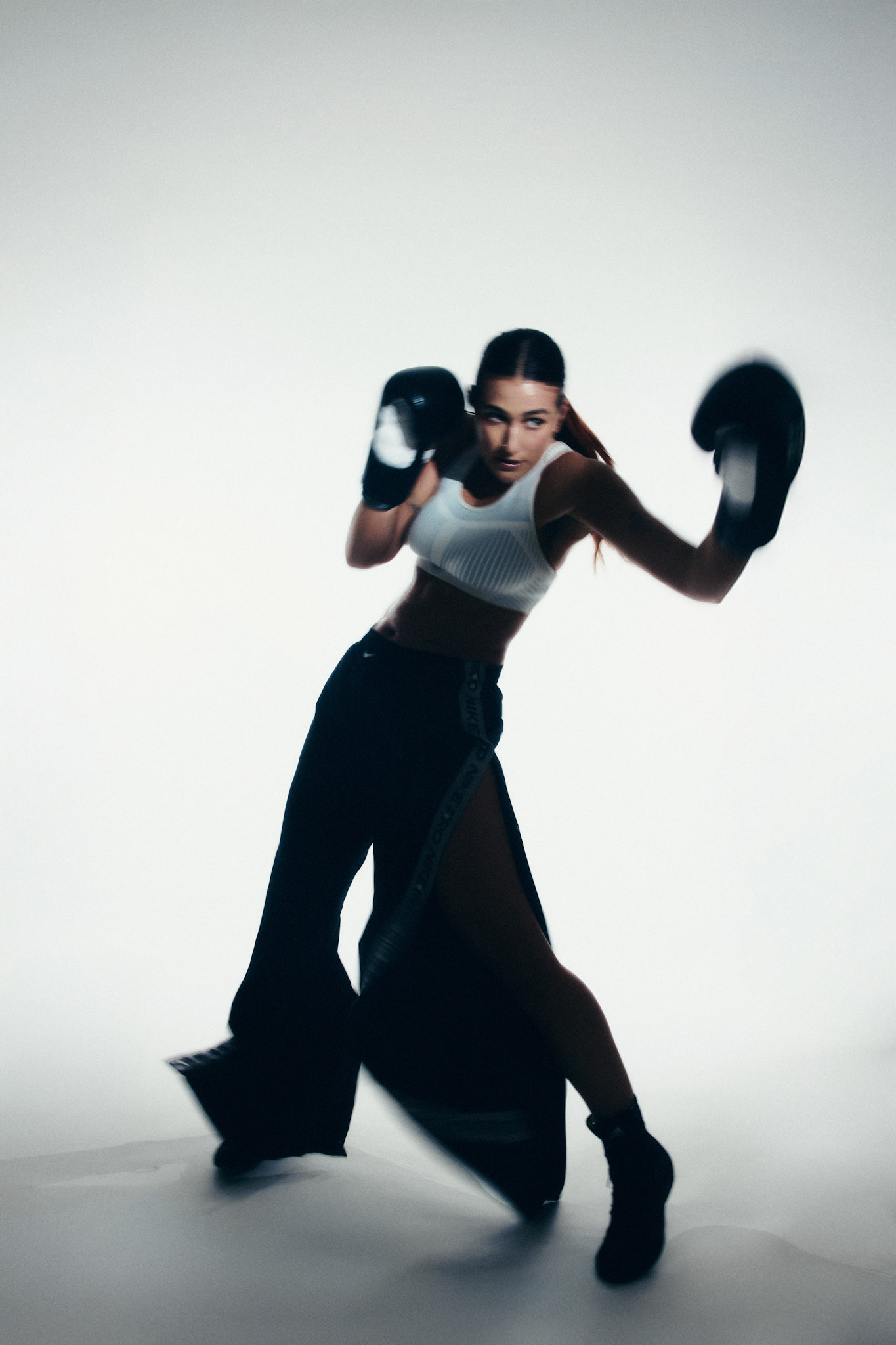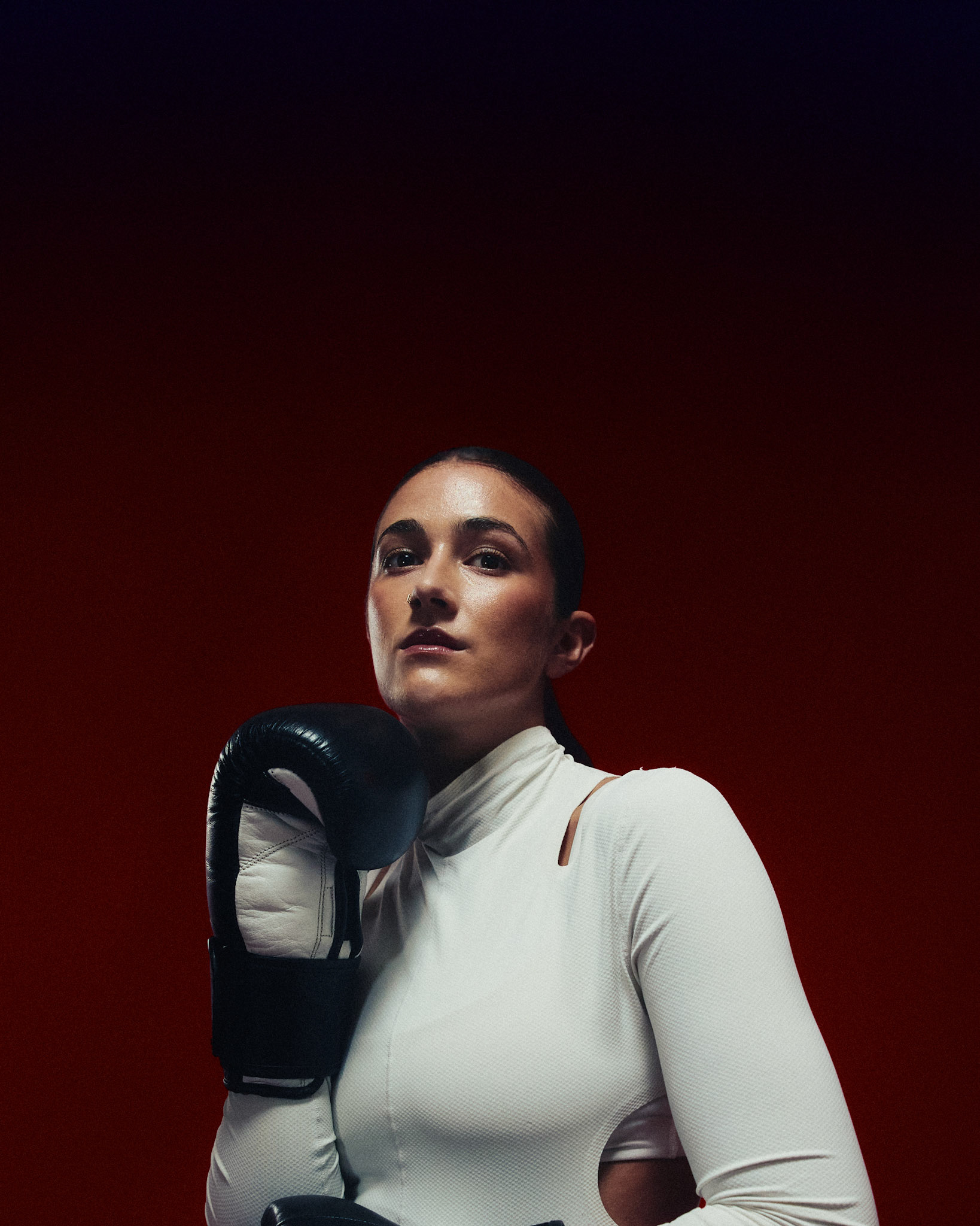 request for editorial: Sport, training, winning, duo, motion, chic, contrasts, color palette: Black - white - grey -burgundy - red, mood: Boxing.