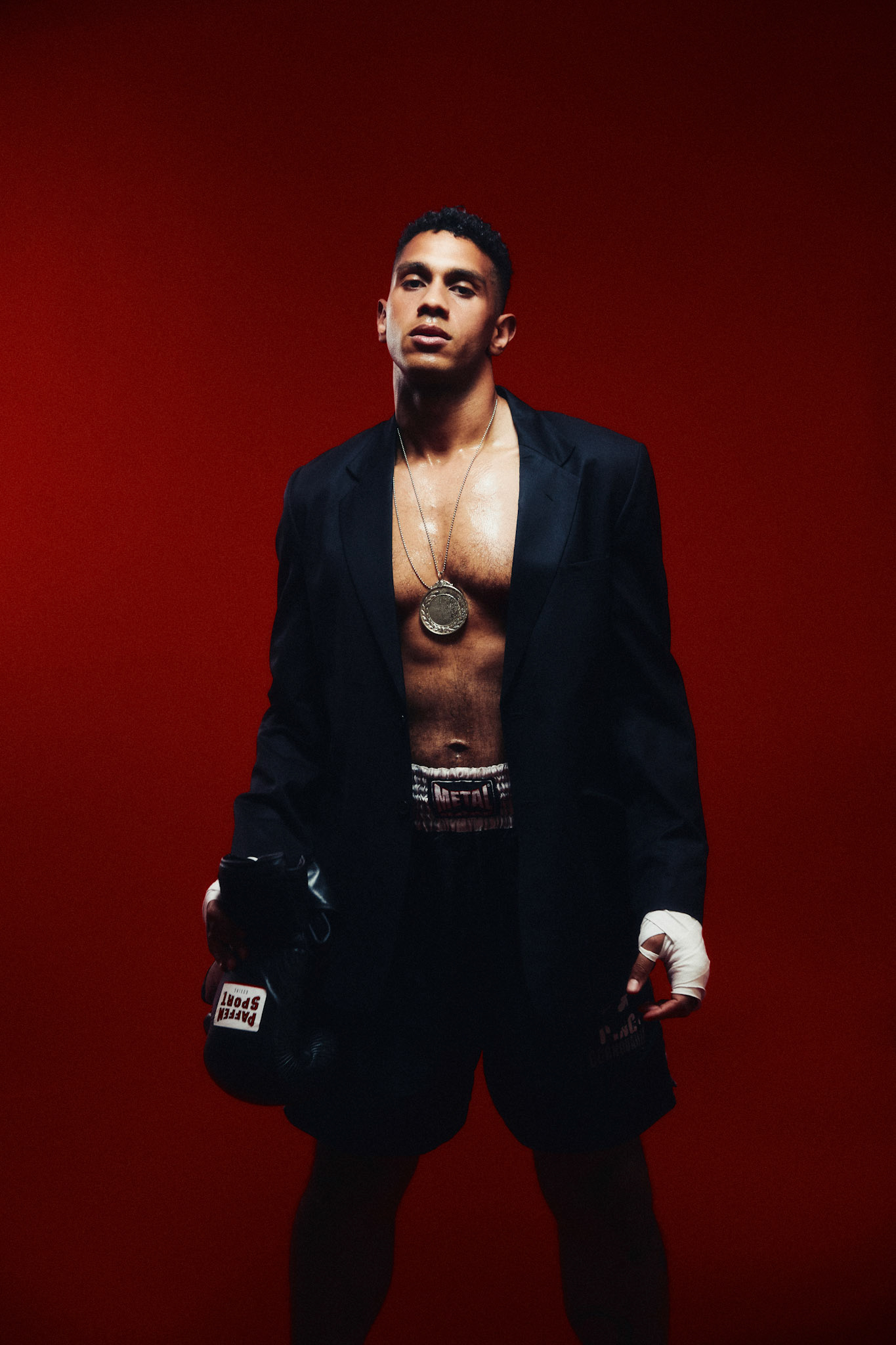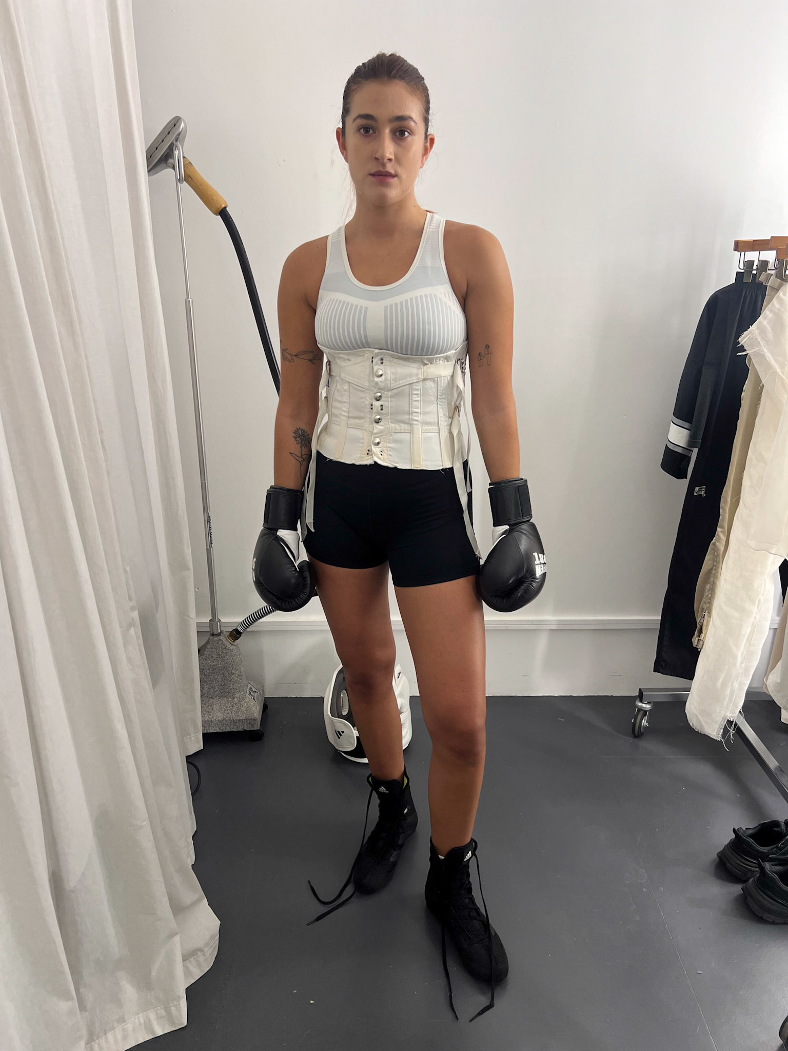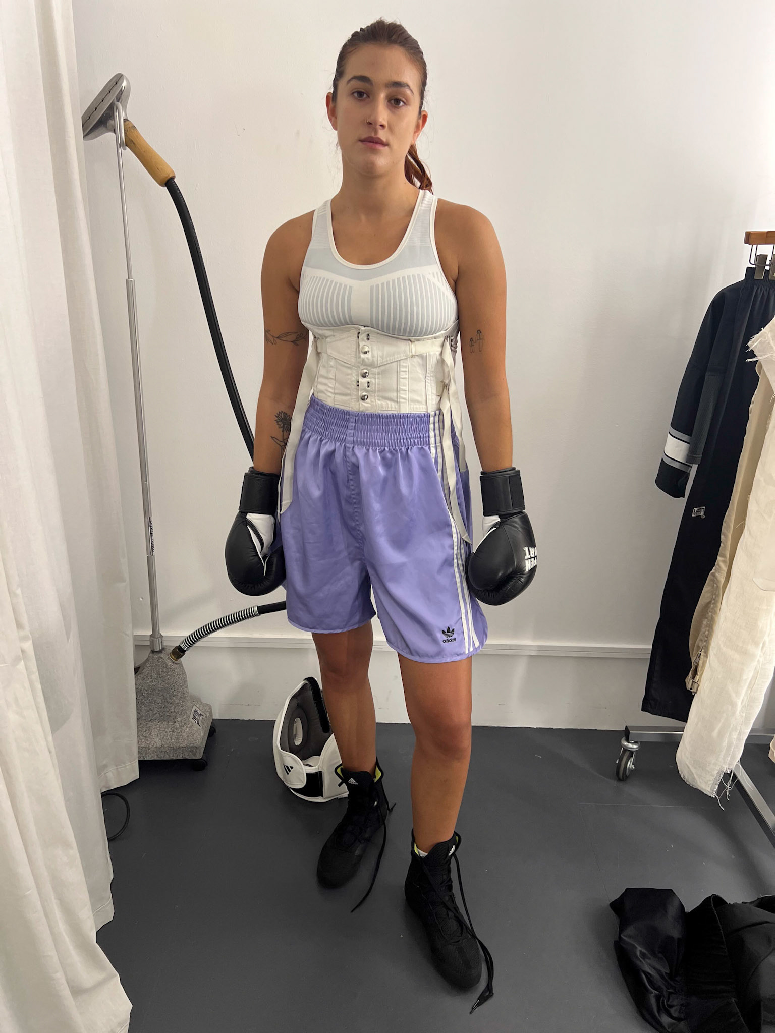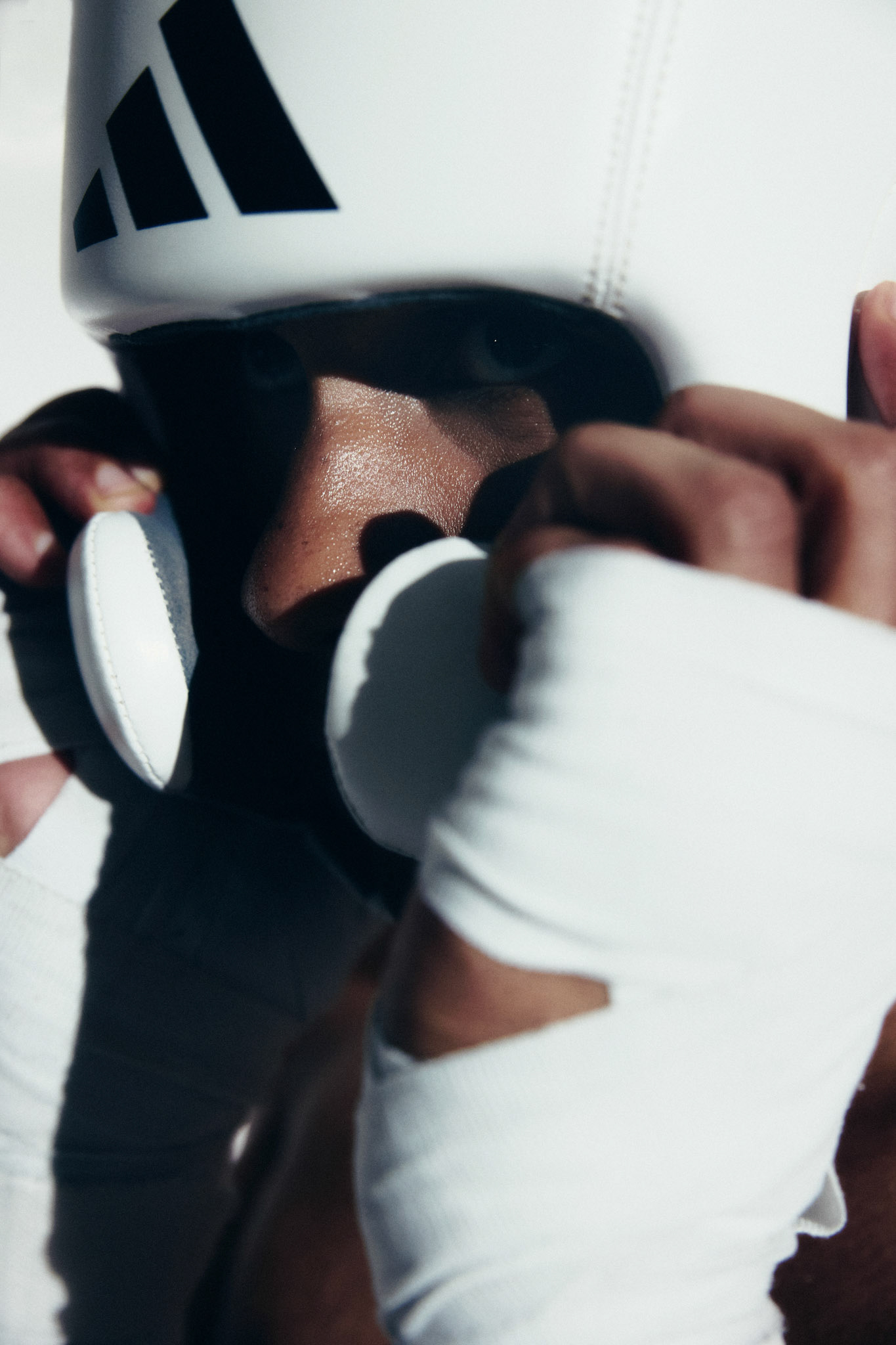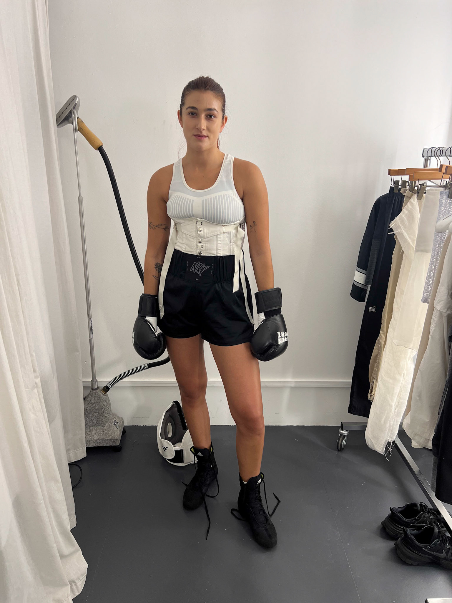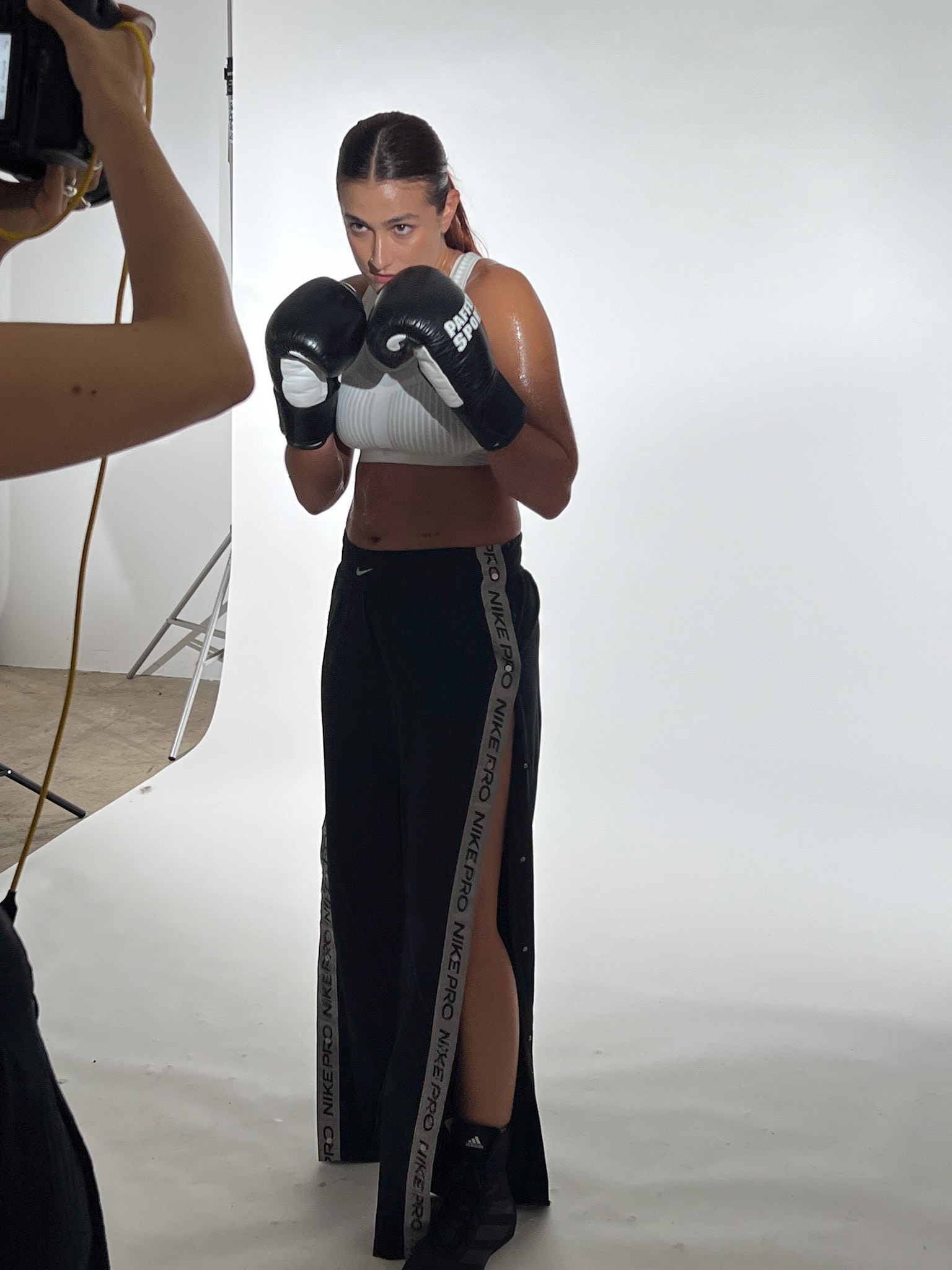 request for editorial: Sport, training, winning, duo, motion, chic, contrasts, color palette: Black - white - grey -burgundy - red, mood: Boxing.