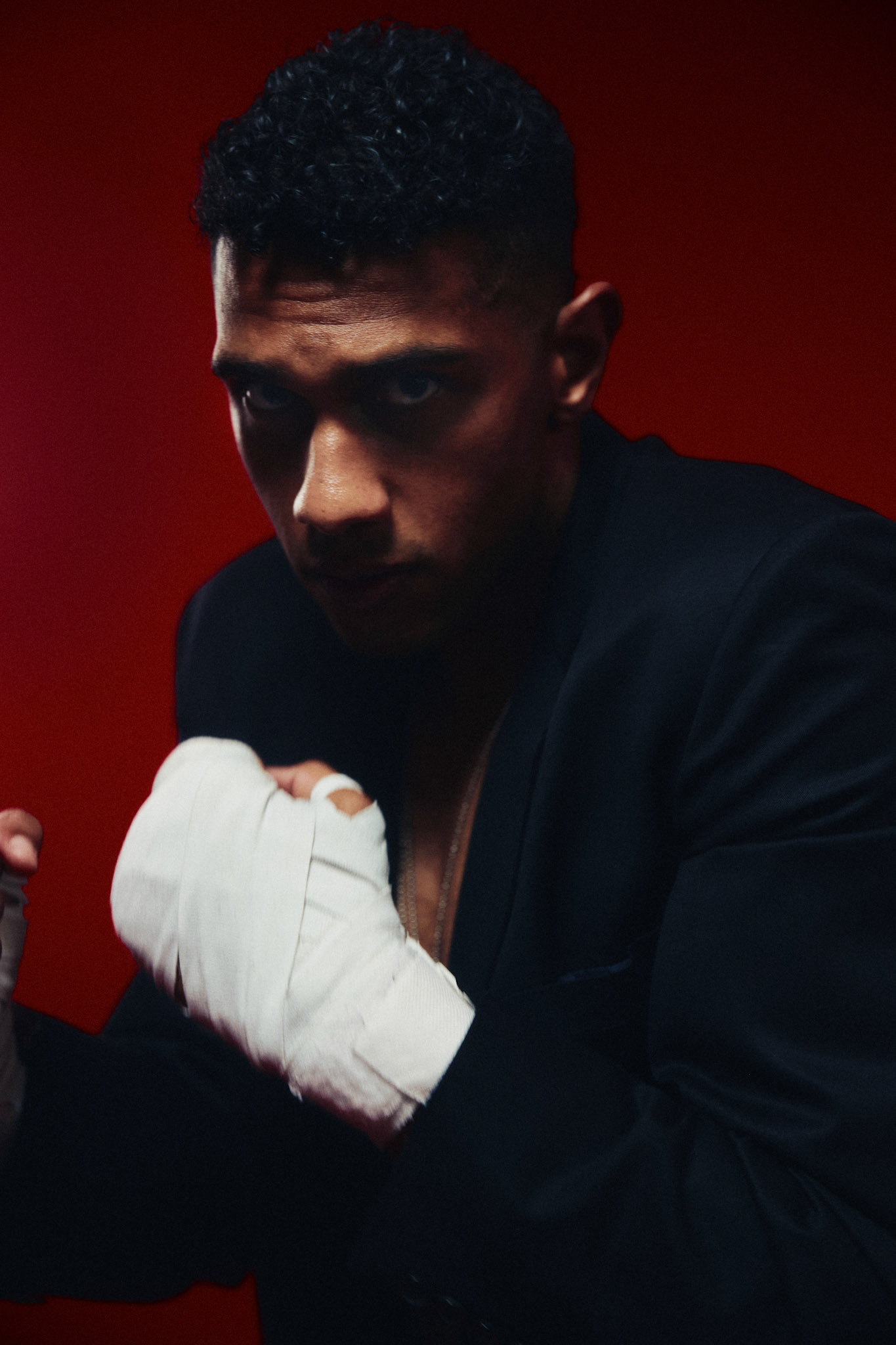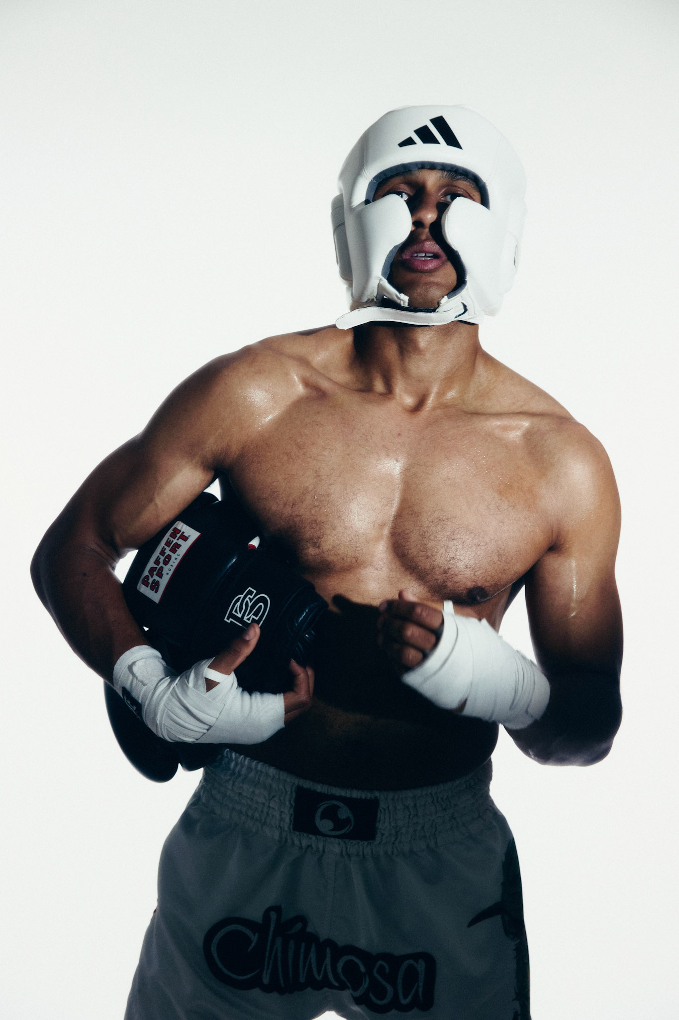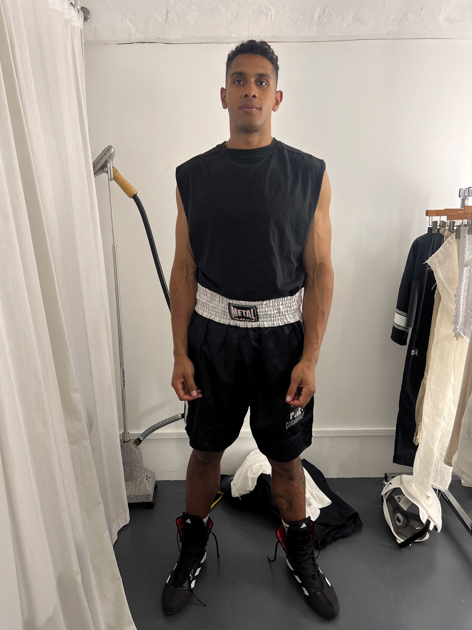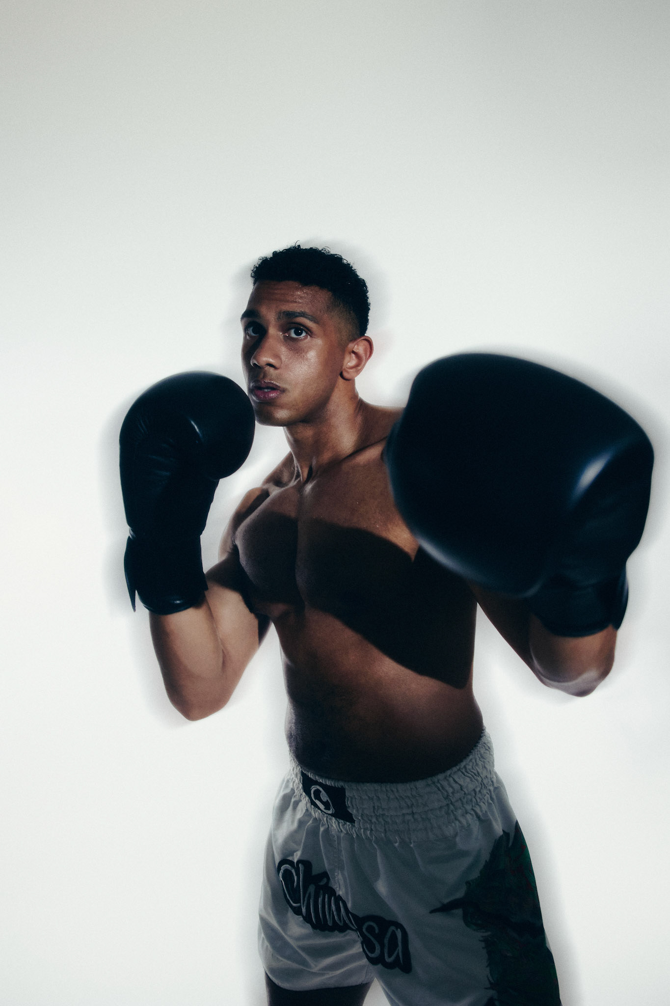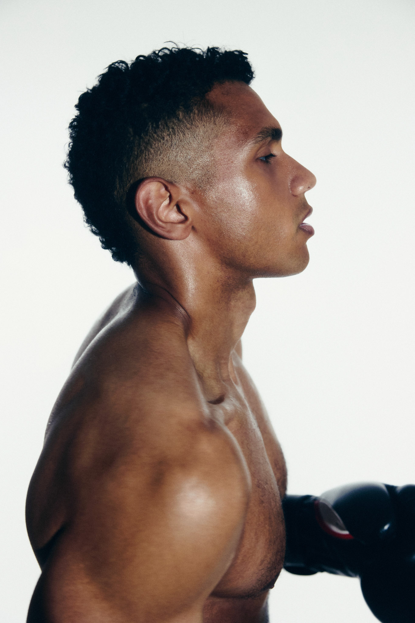 request for editorial: Sport, training, winning, duo, motion, chic, contrasts, color palette: Black - white - grey -burgundy - red, mood: Boxing.