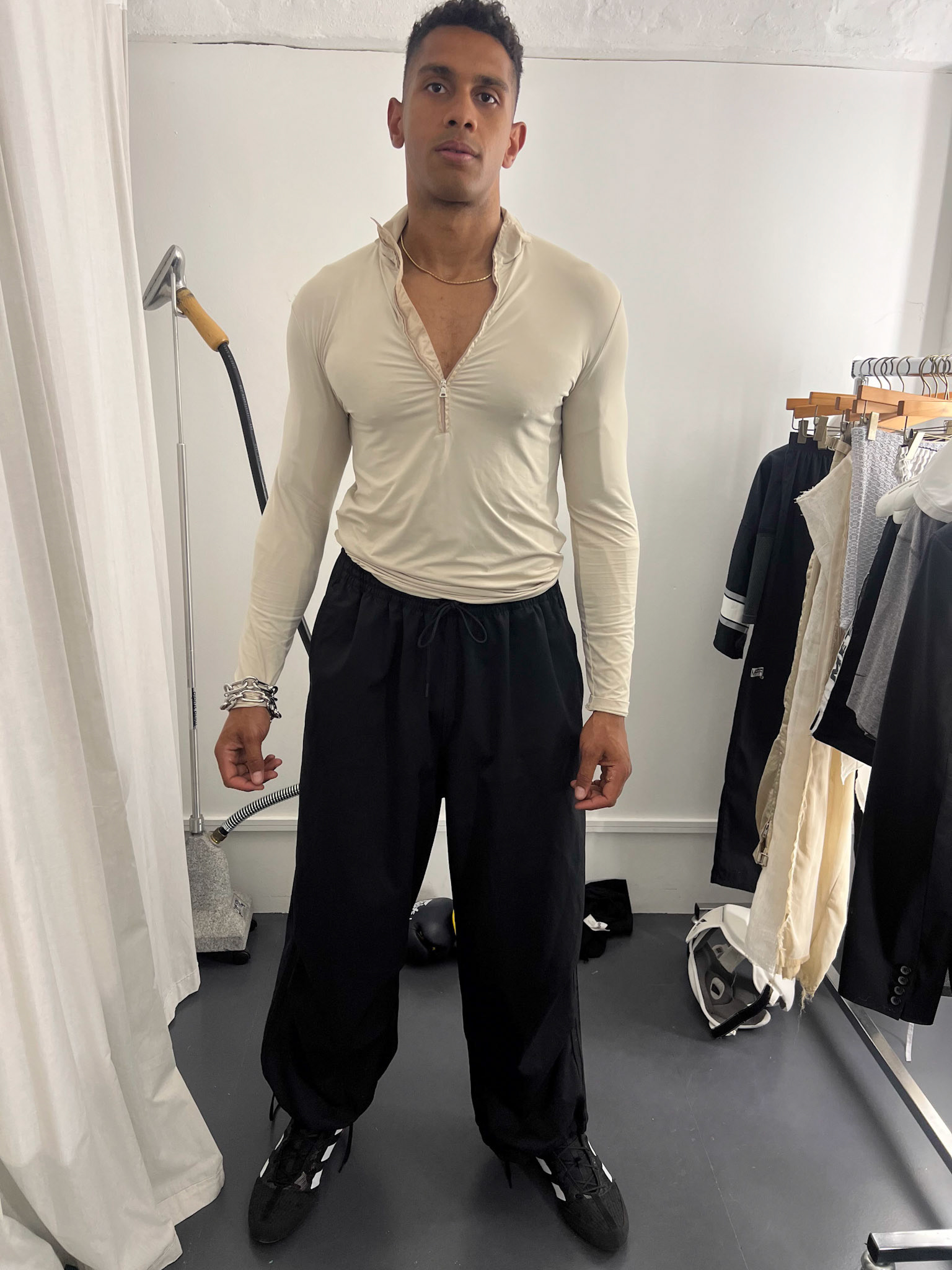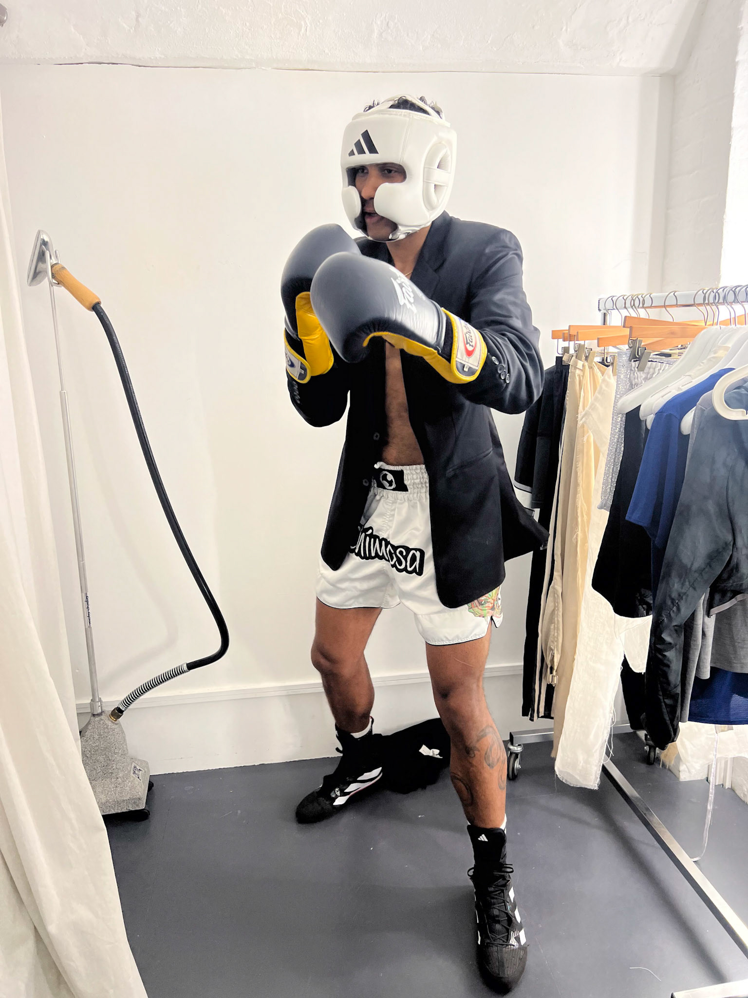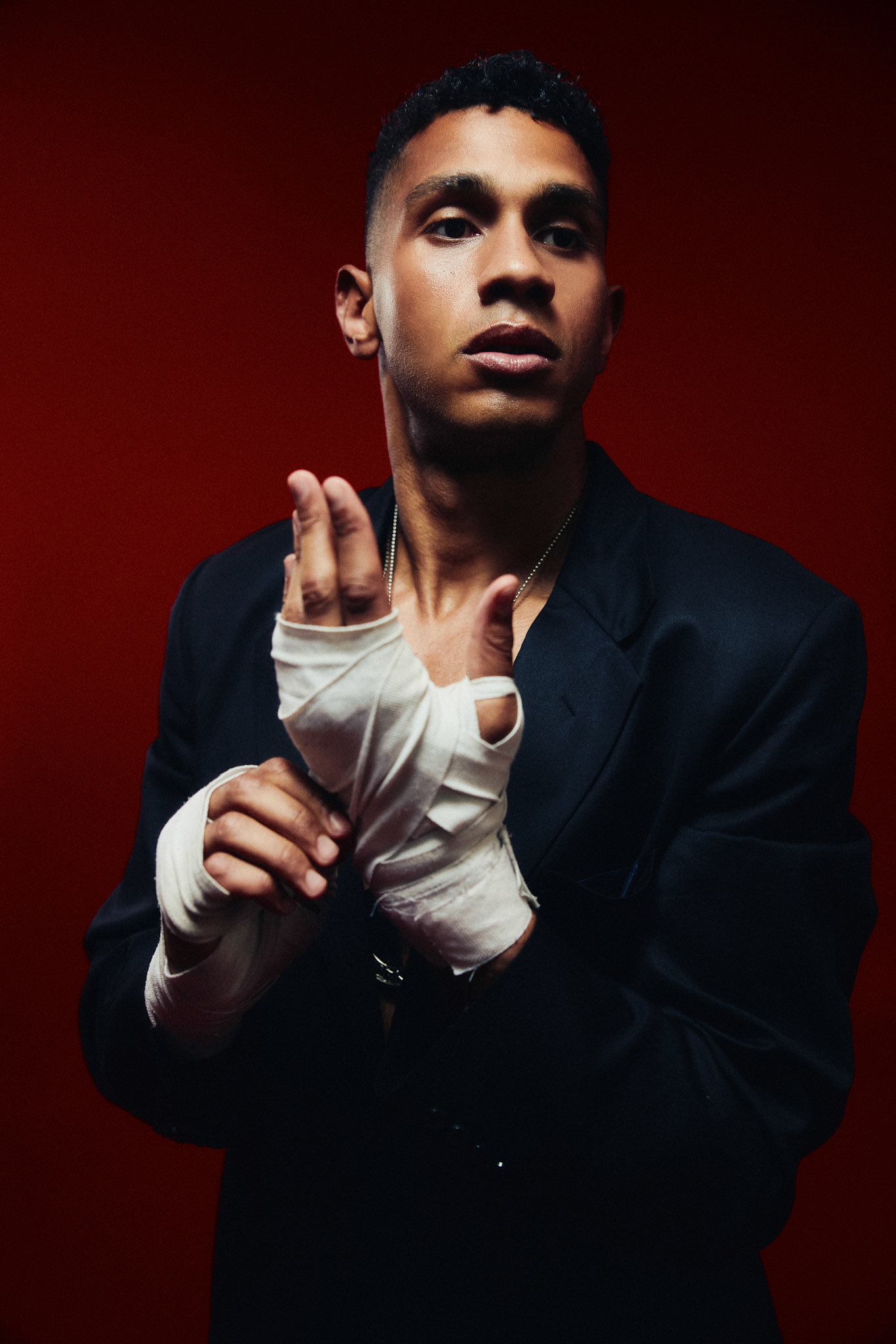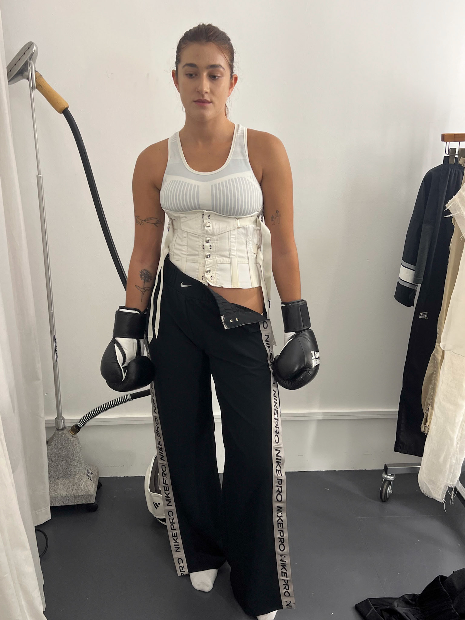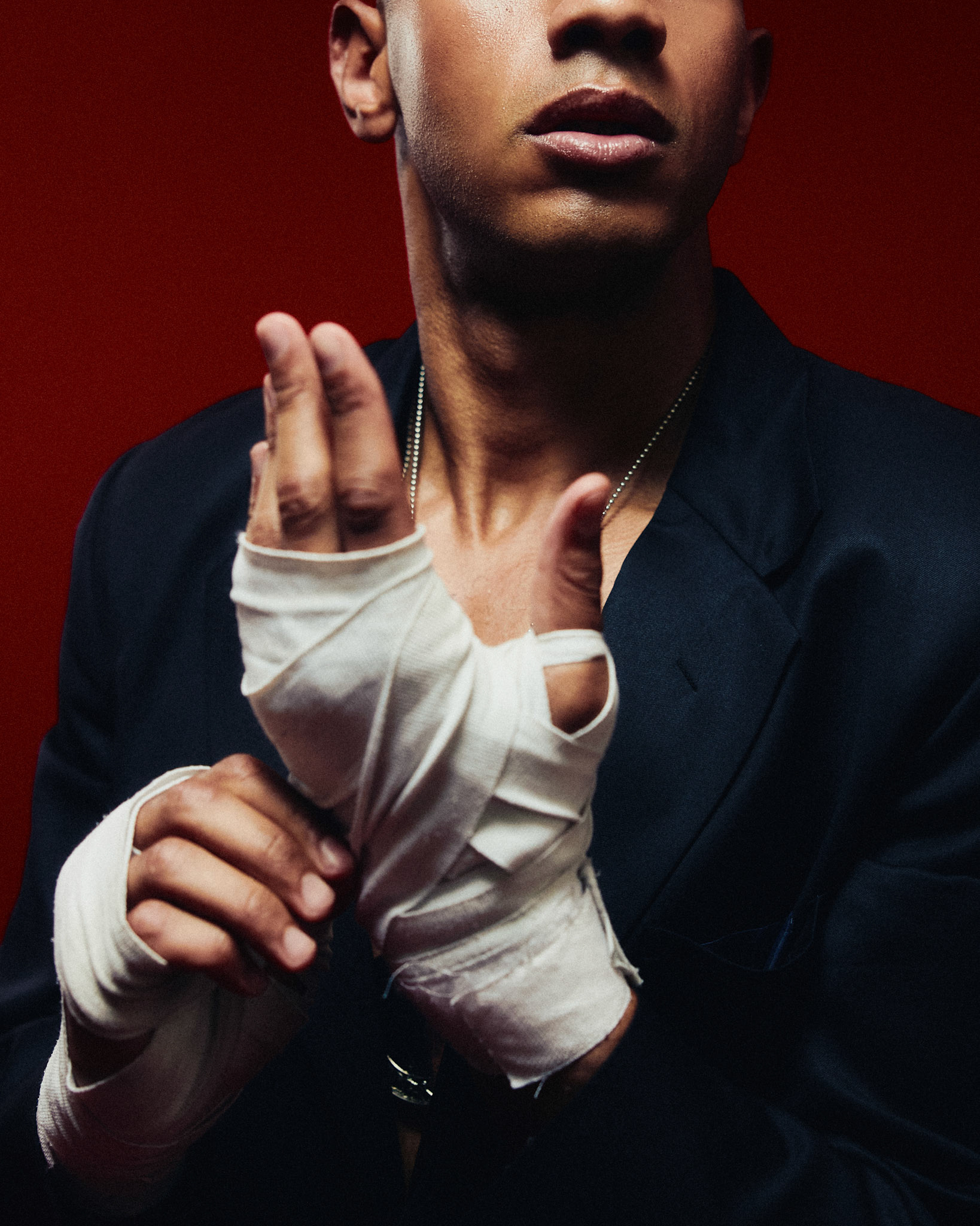 request for editorial: Sport, training, winning, duo, motion, chic, contrasts, color palette: Black - white - grey -burgundy - red, mood: Boxing.