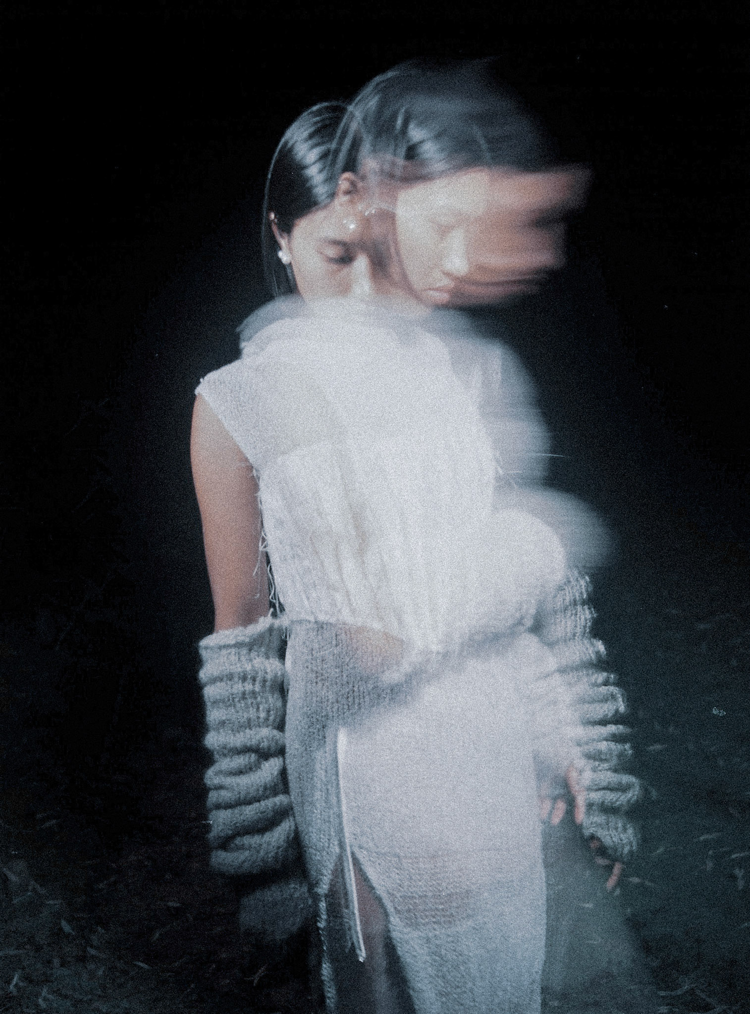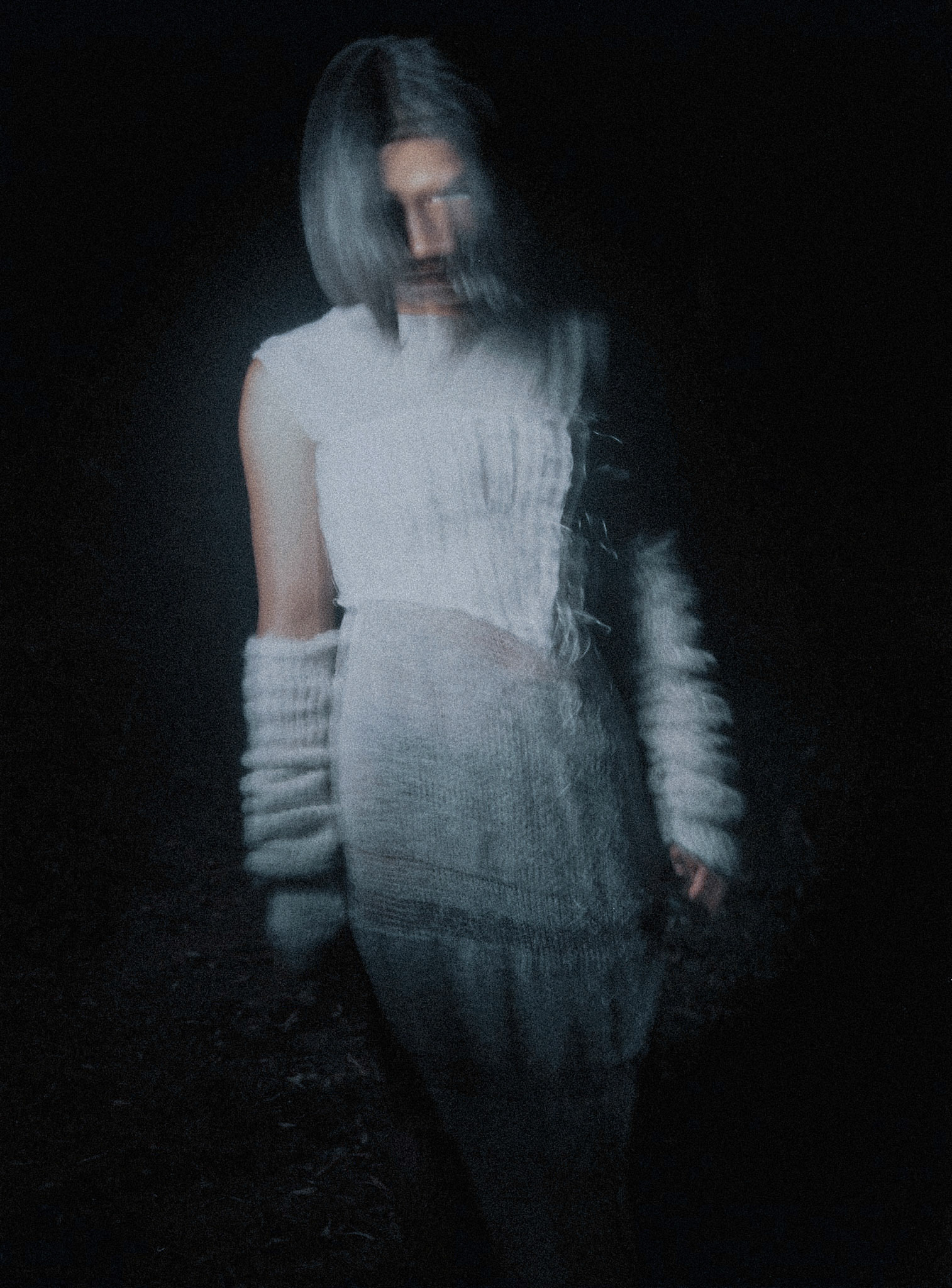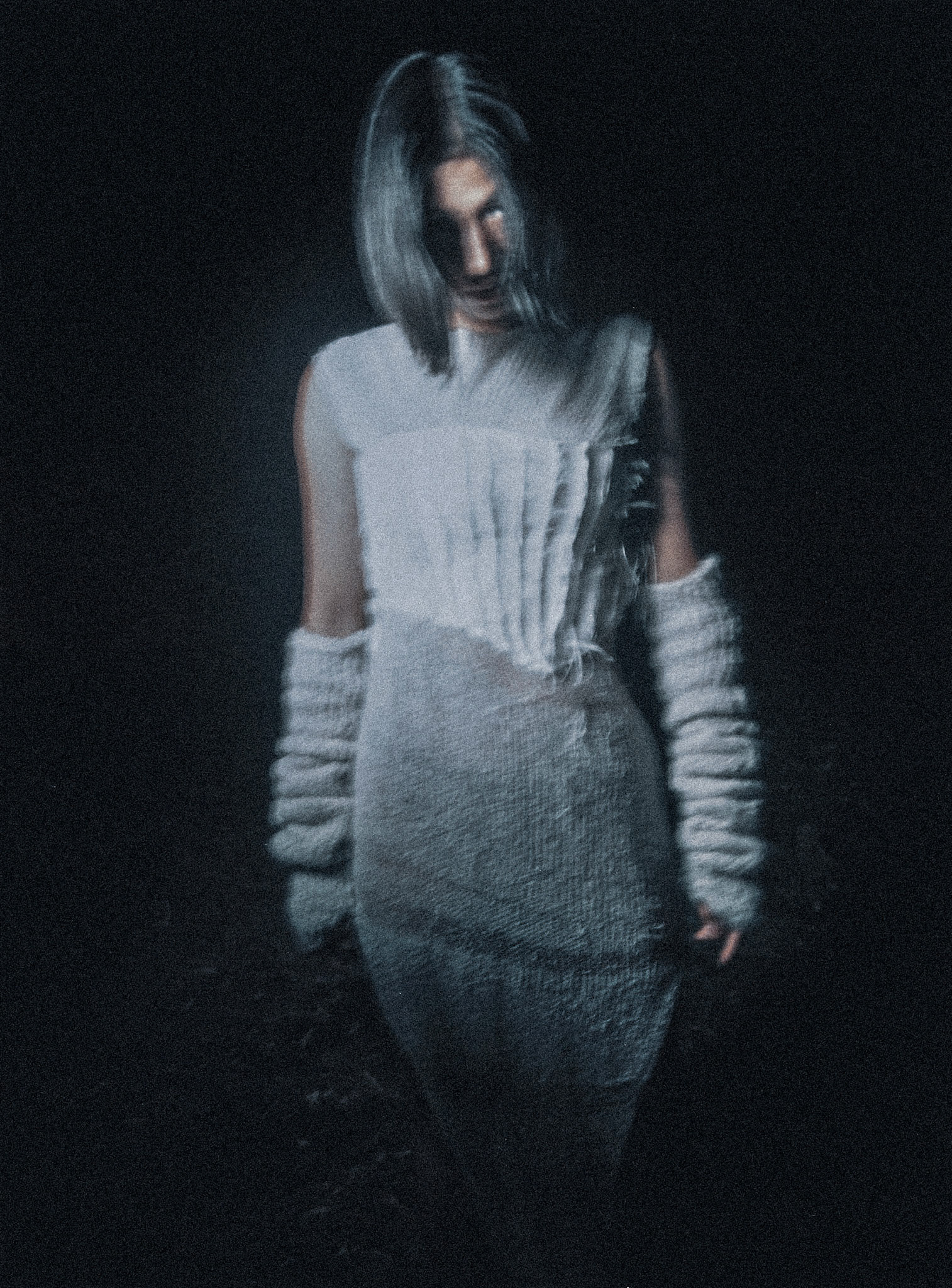 request for editorial: Raw edges, structural materials, softness, chaotic, experiments layering, color palette: White - off white - grey, mood: Kintsugi - broken items.