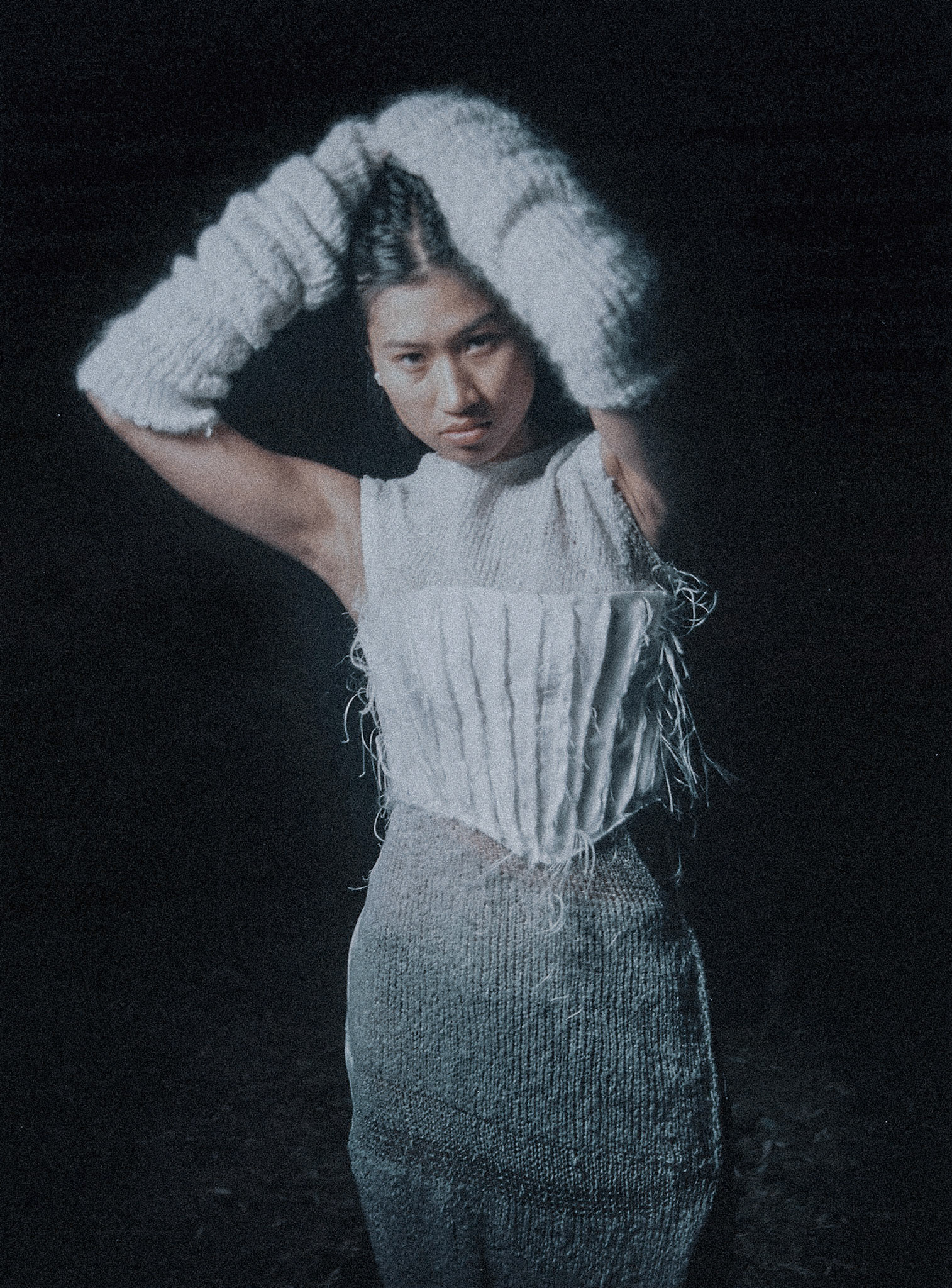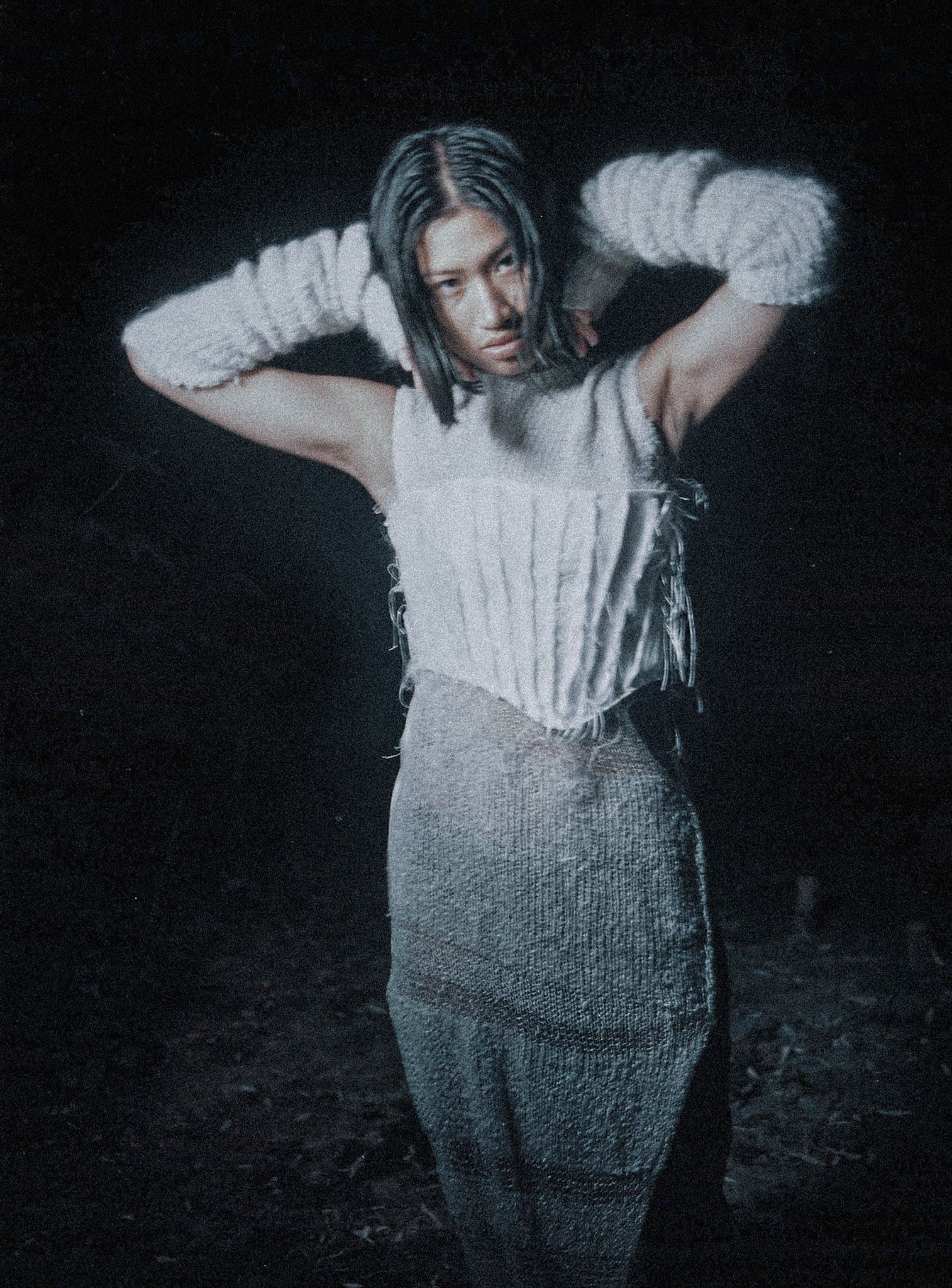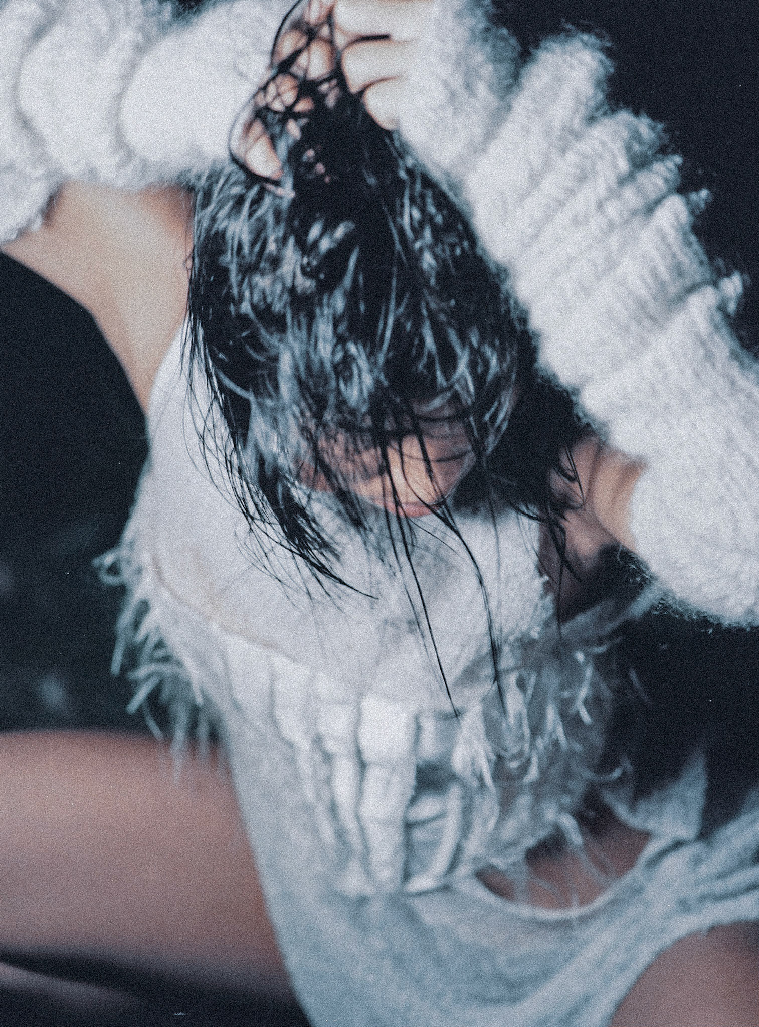 request for editorial: Raw edges, structural materials, softness, chaotic, experiments layering, color palette: White - off white - grey, mood: Kintsugi - broken items.