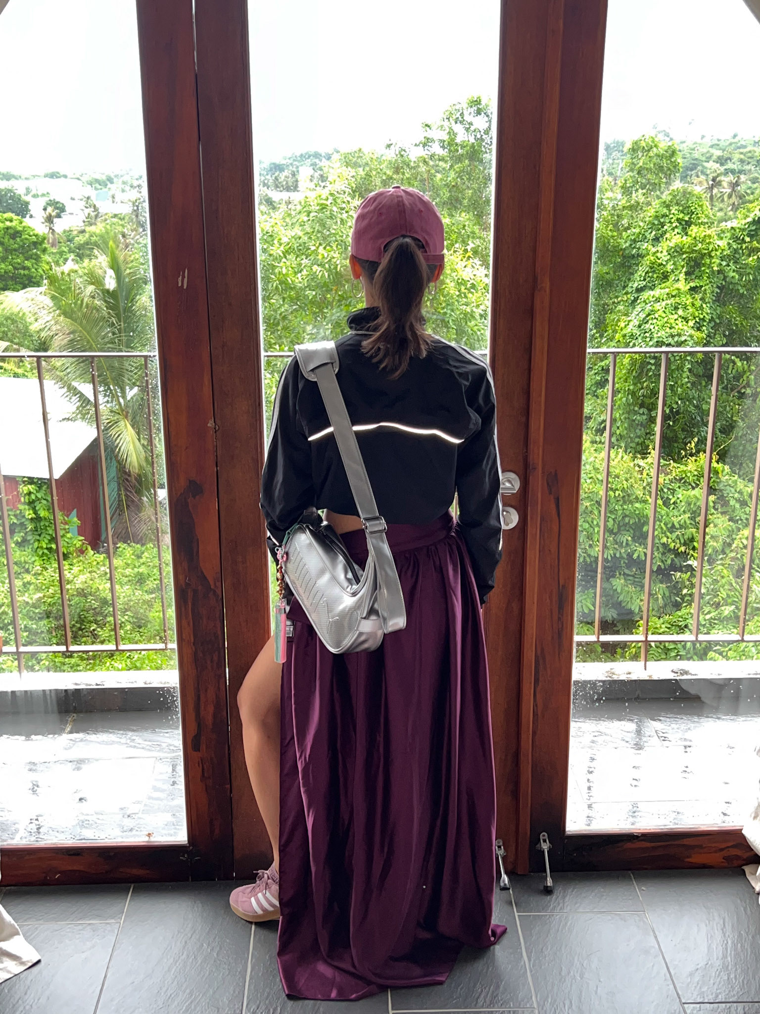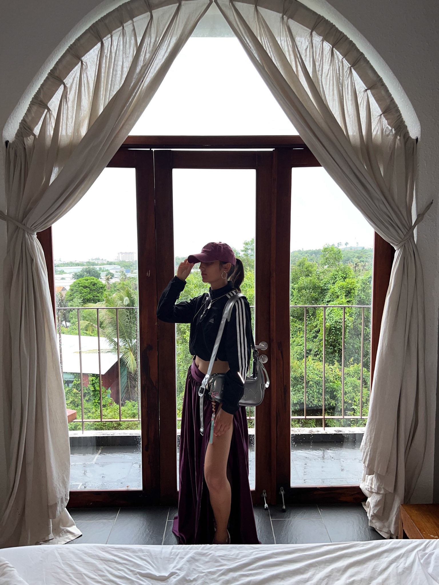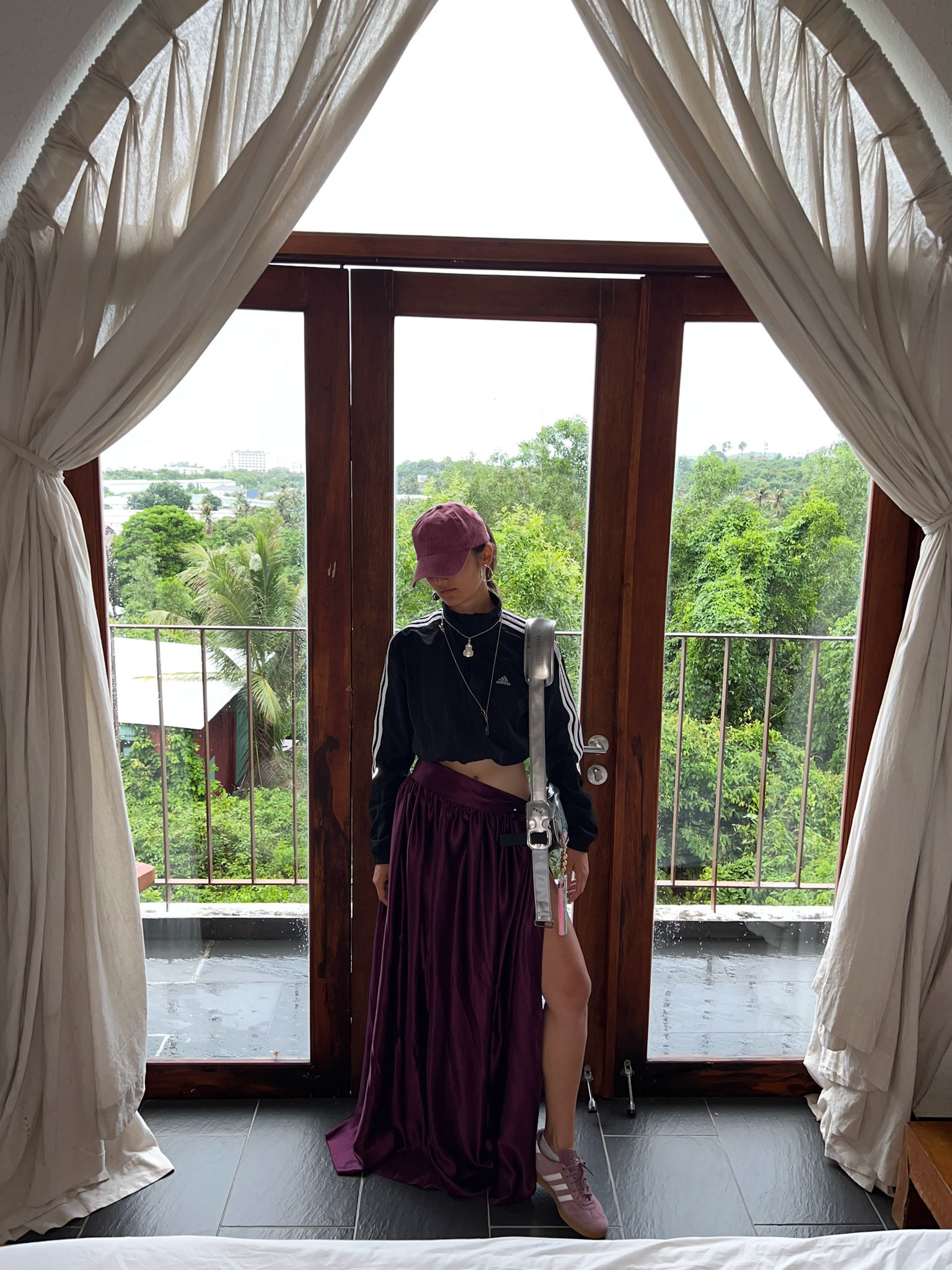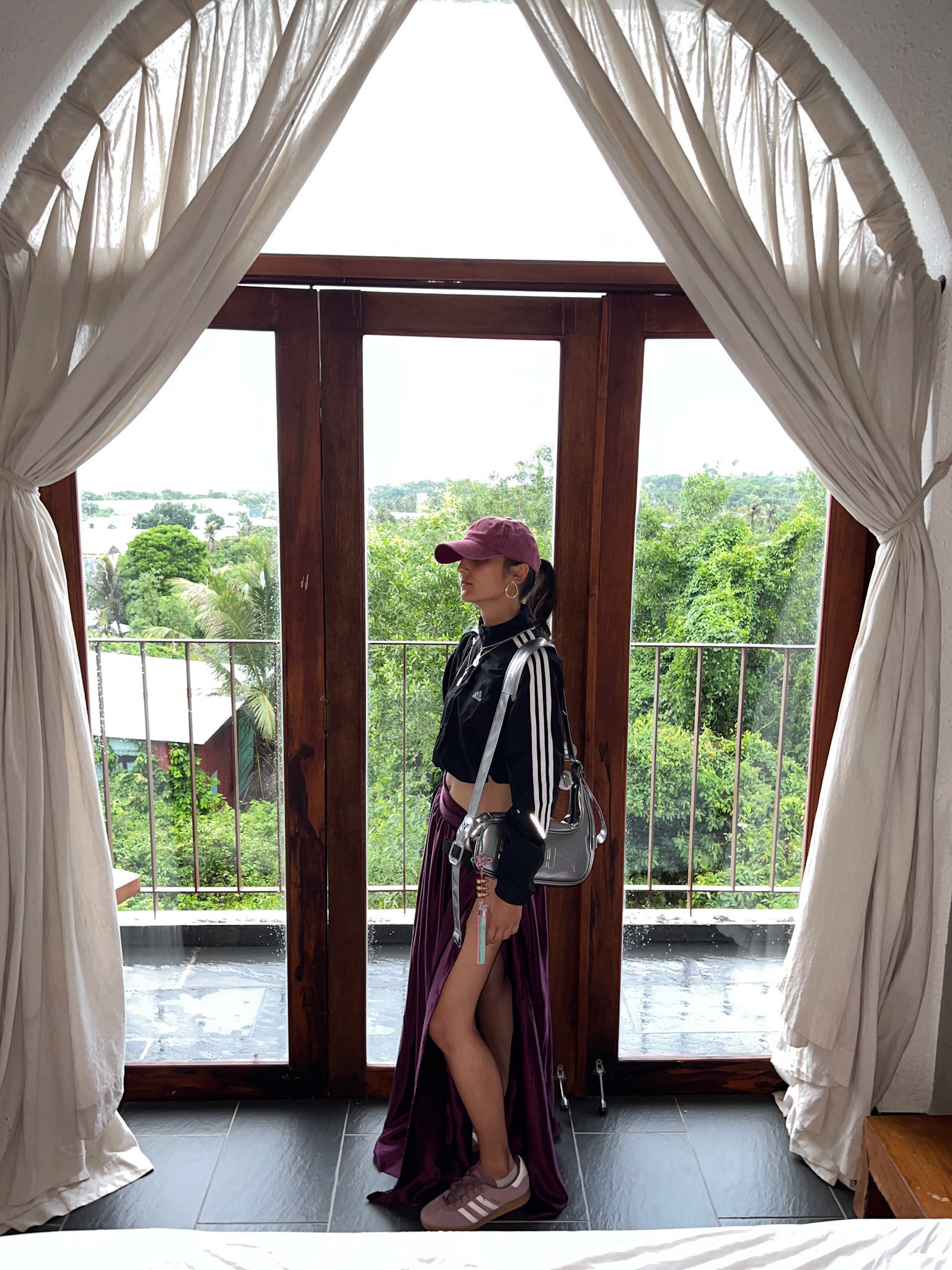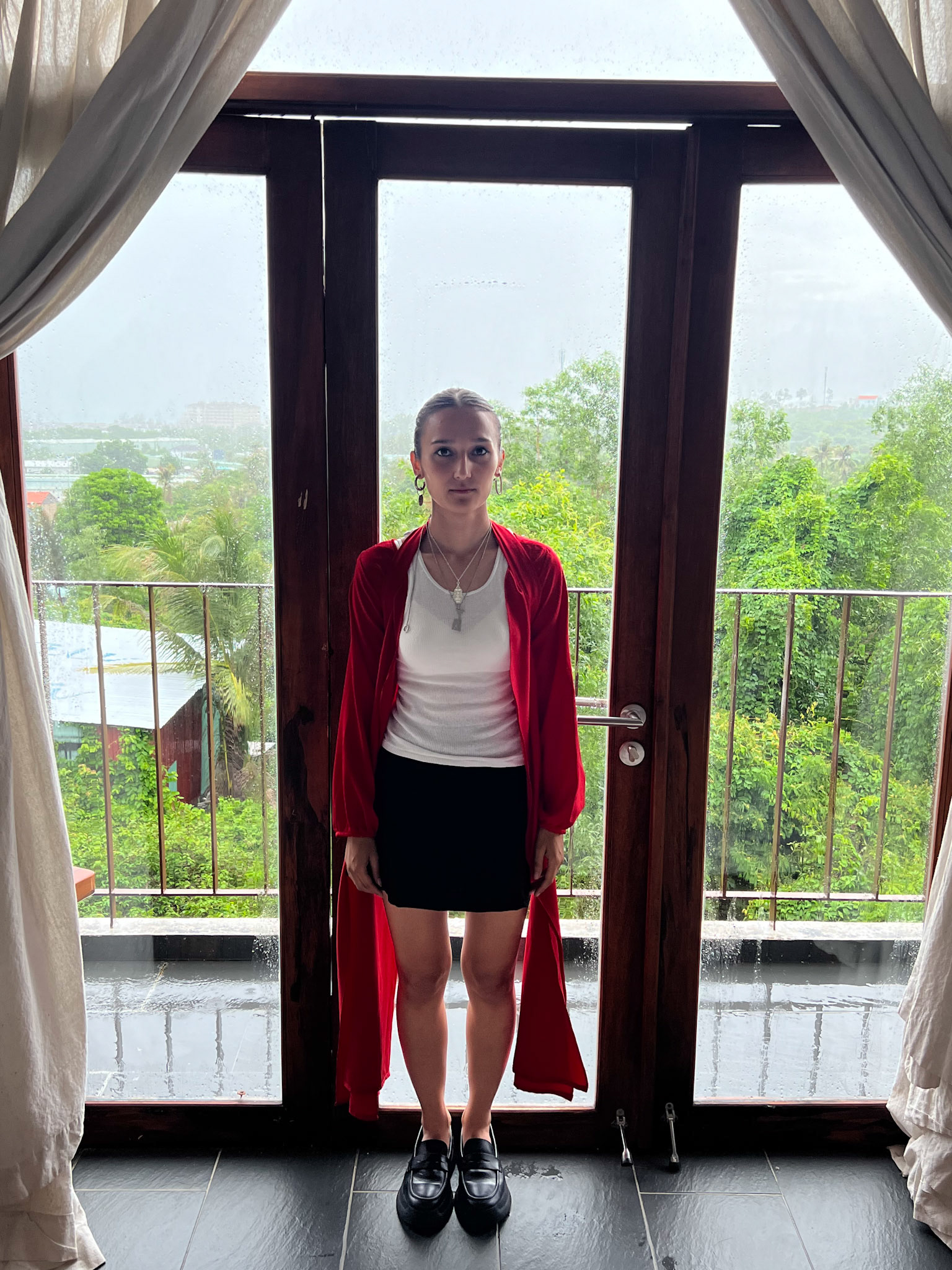 request for upcoming music video: Sporty chic, fluent, wide range of motion, experimental, color palette: Red - burgundy - blue - white, mood: Summer vacation.