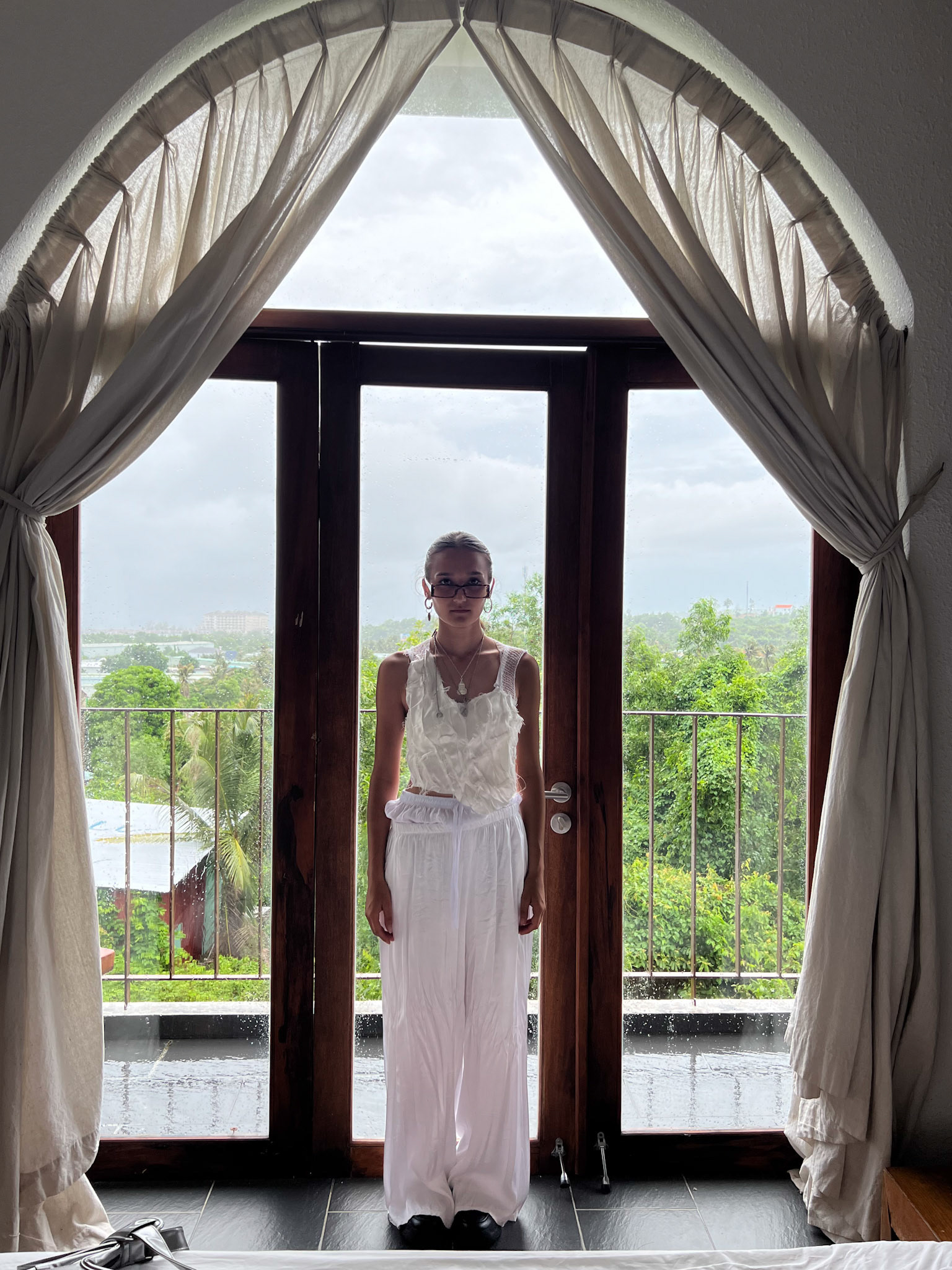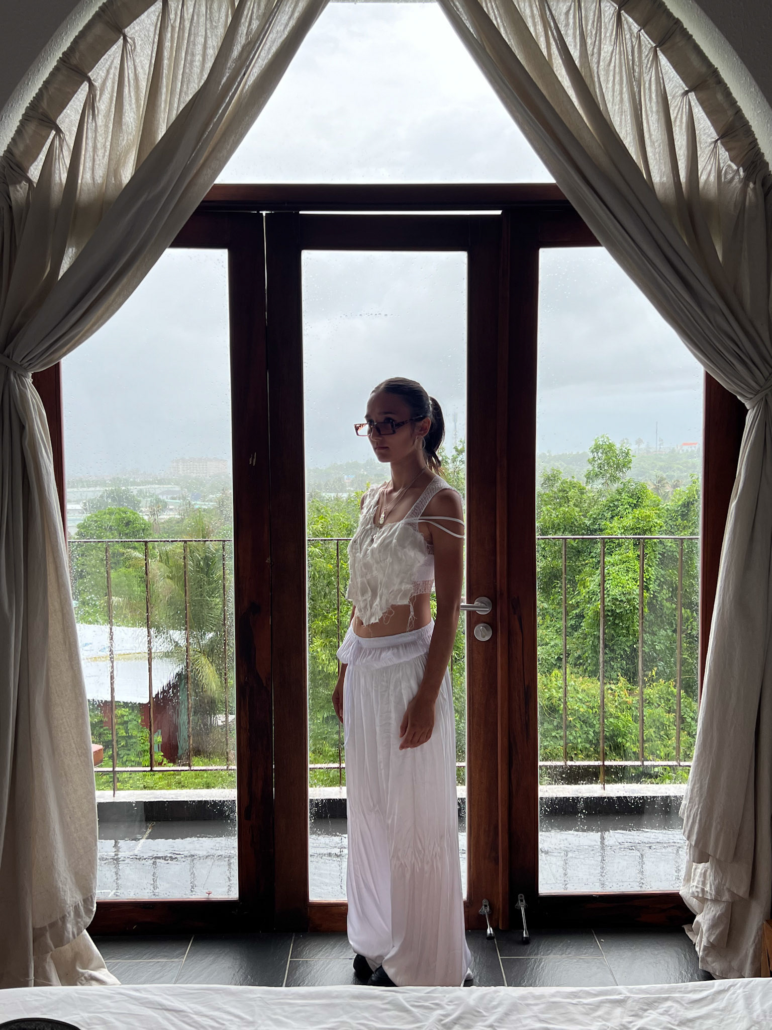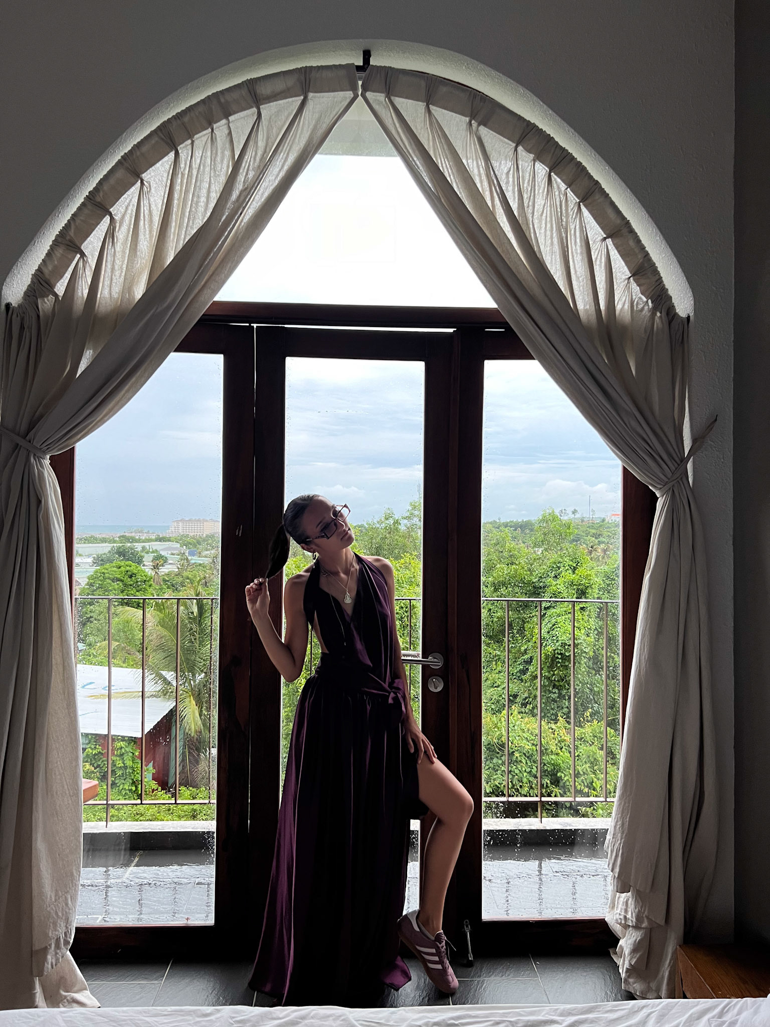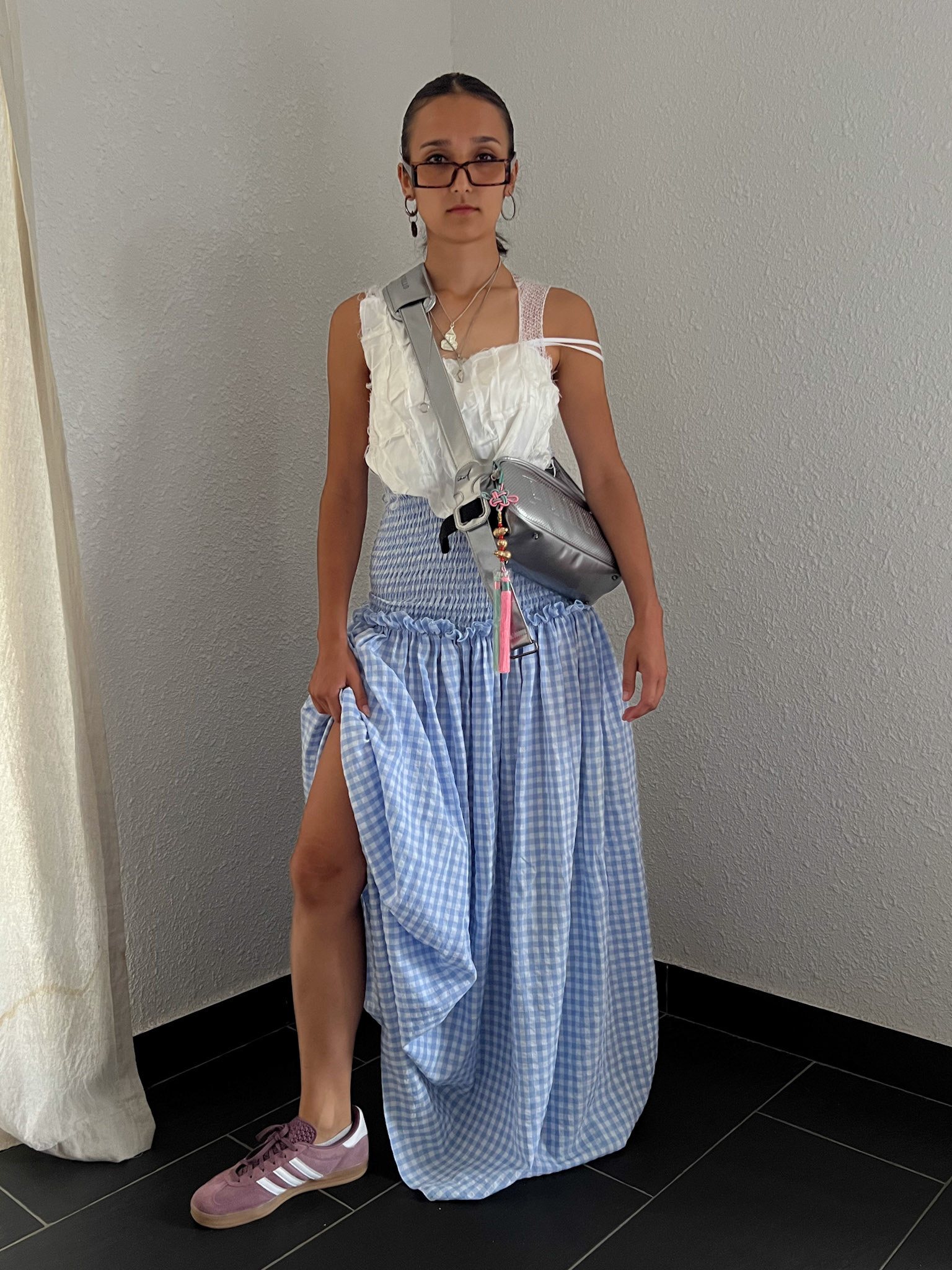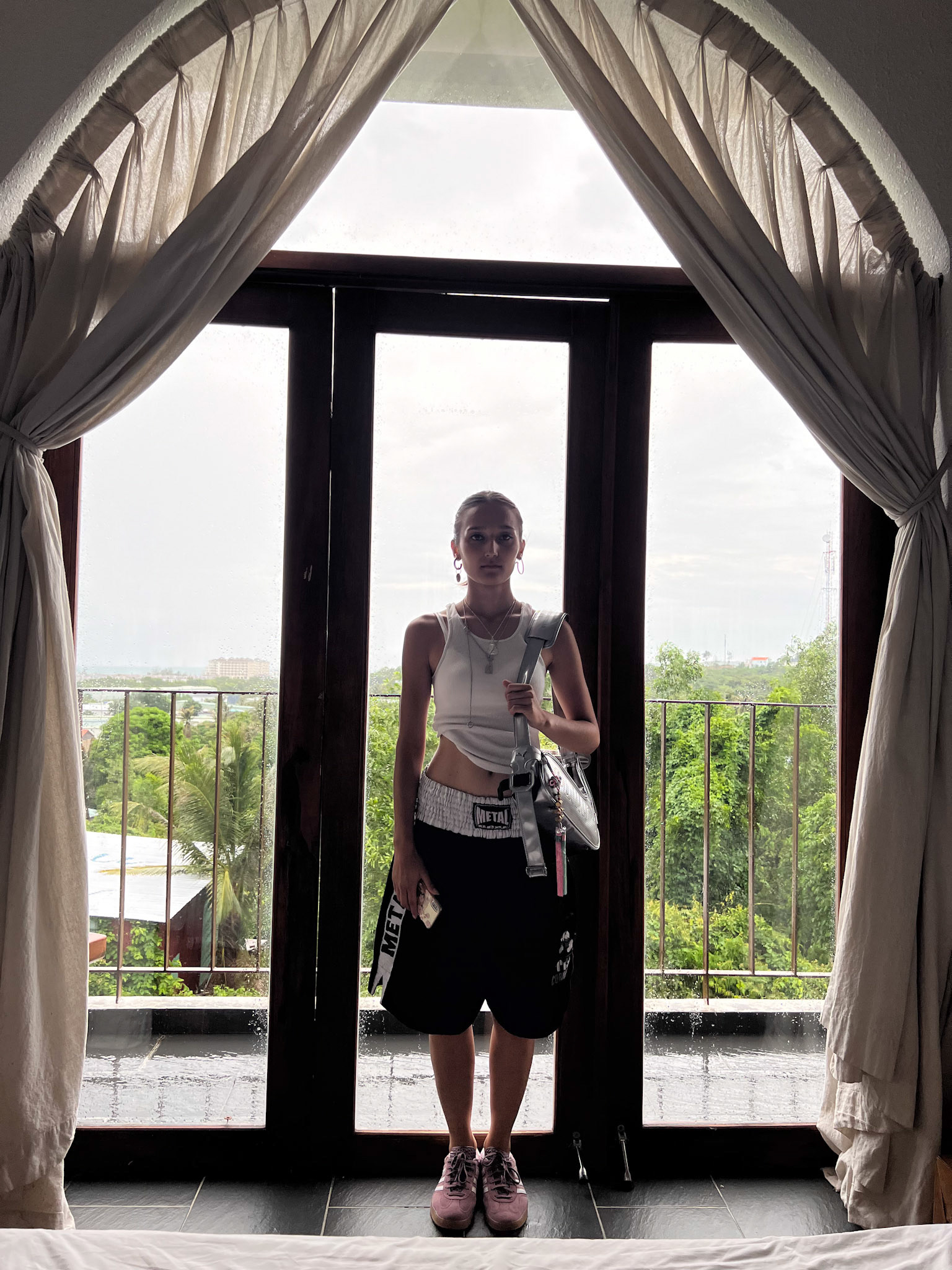 request for upcoming music video: Sporty chic, fluent, wide range of motion, experimental, color palette: Red - burgundy - blue - white, mood: Summer vacation.