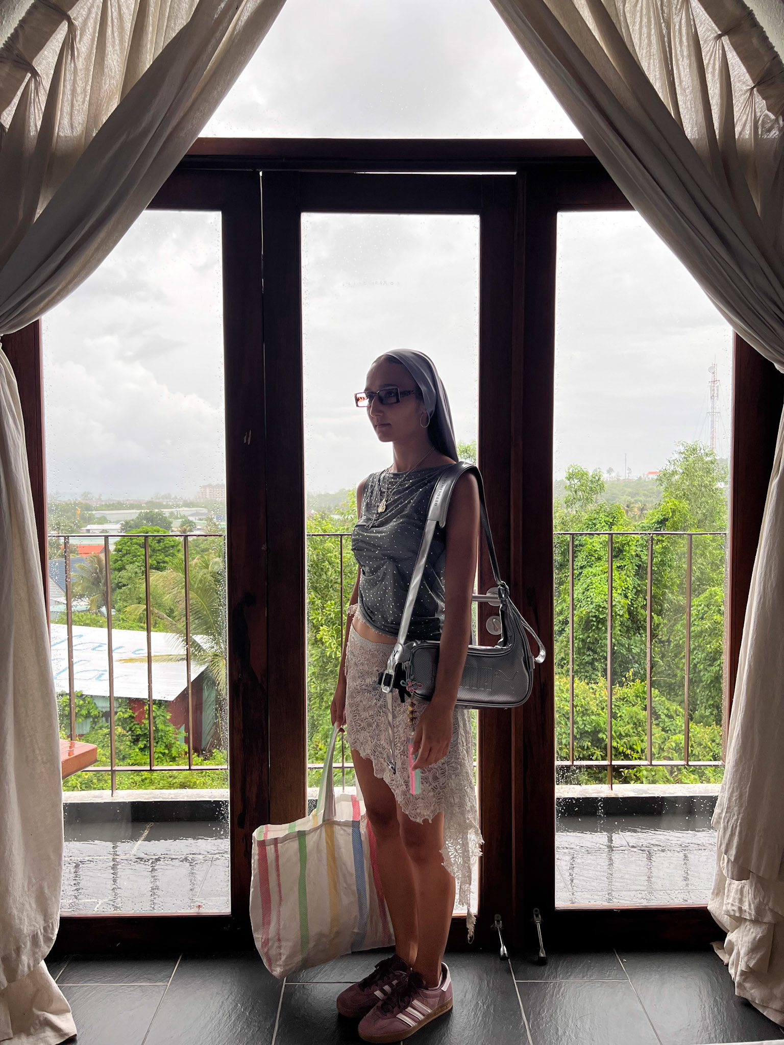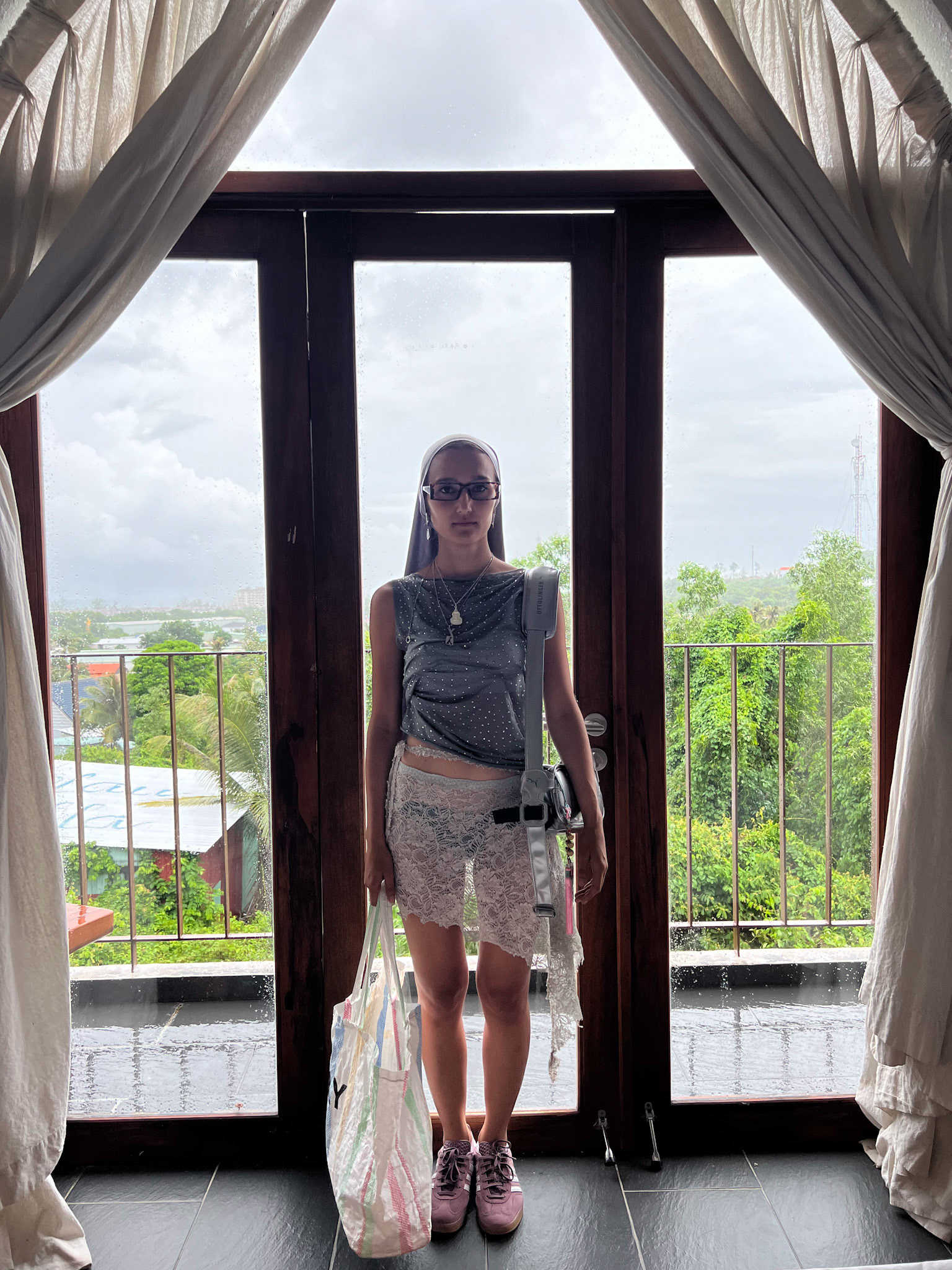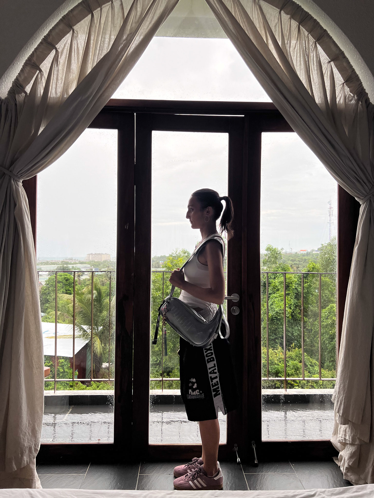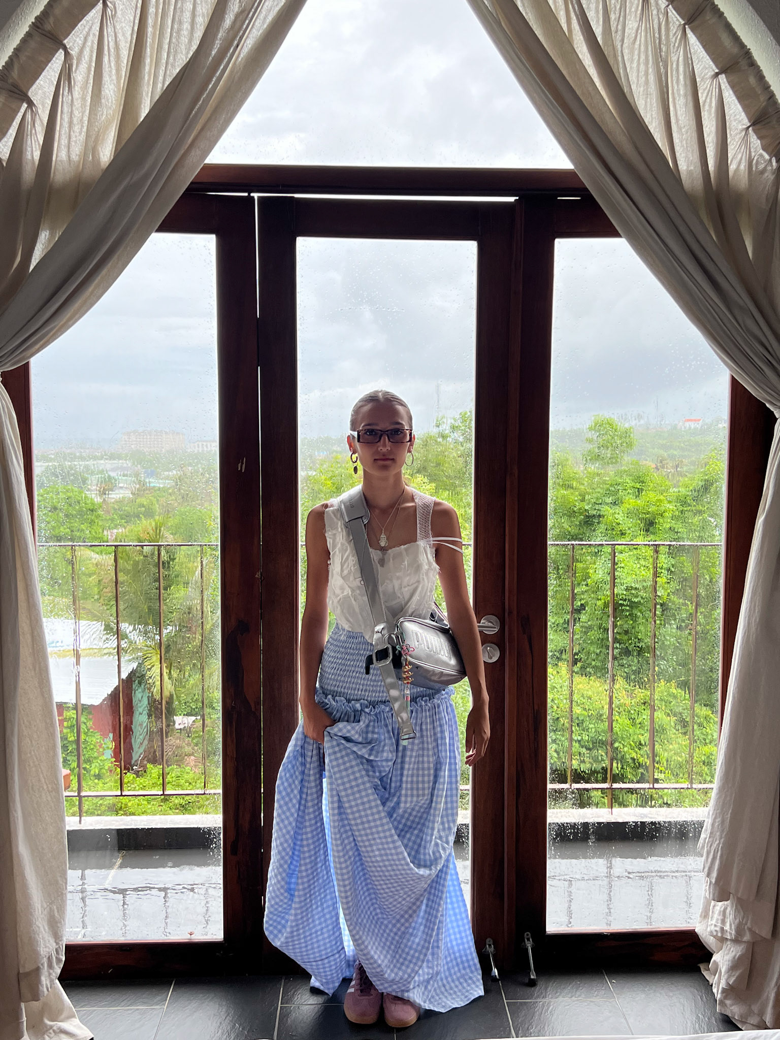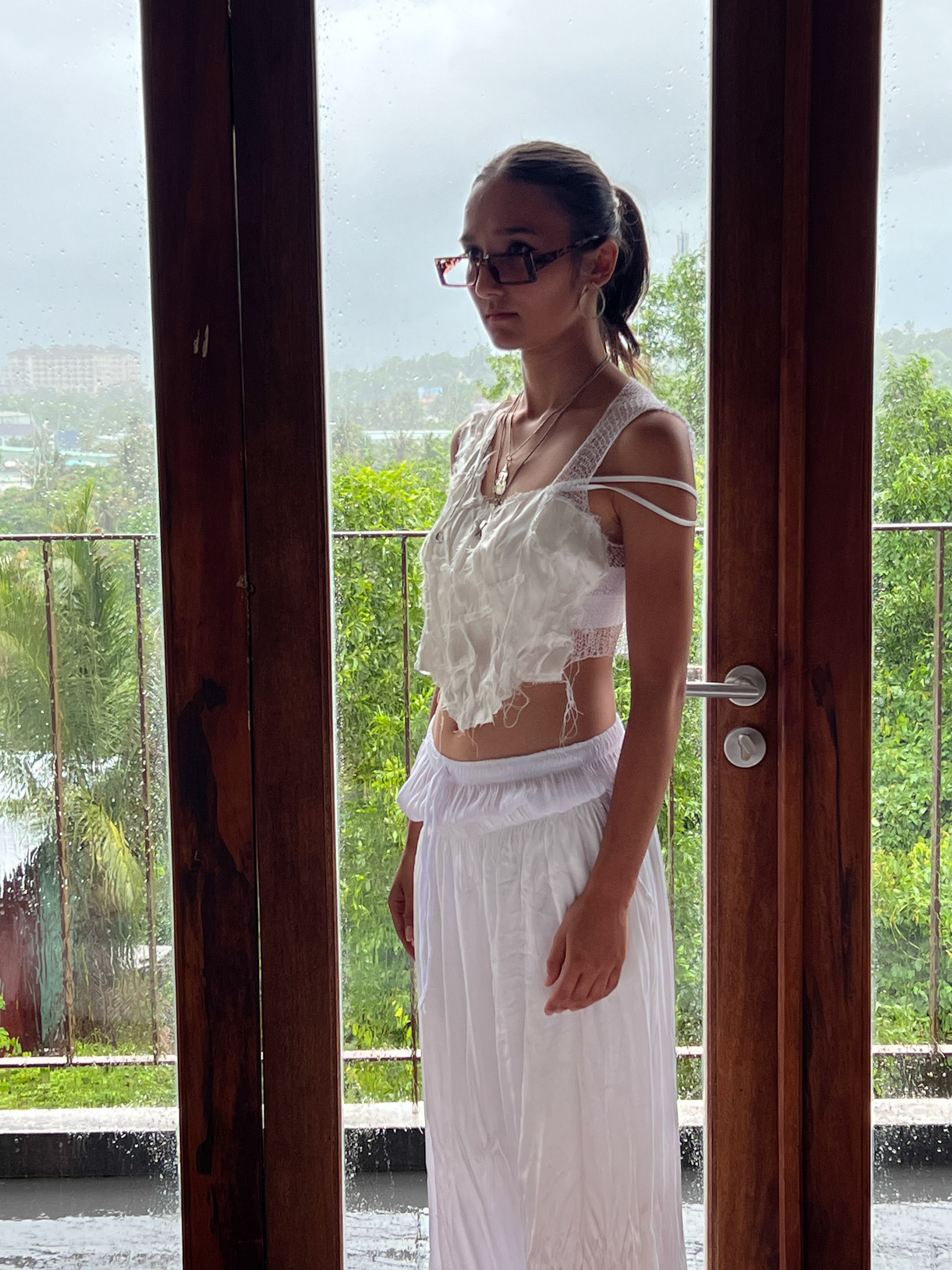 request for upcoming music video: Sporty chic, fluent, wide range of motion, experimental, color palette: Red - burgundy - blue - white, mood: Summer vacation.