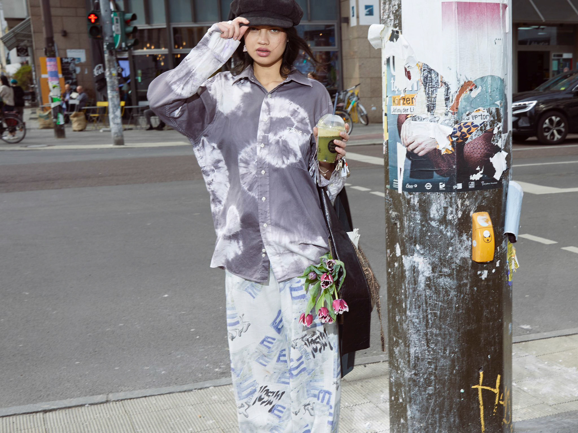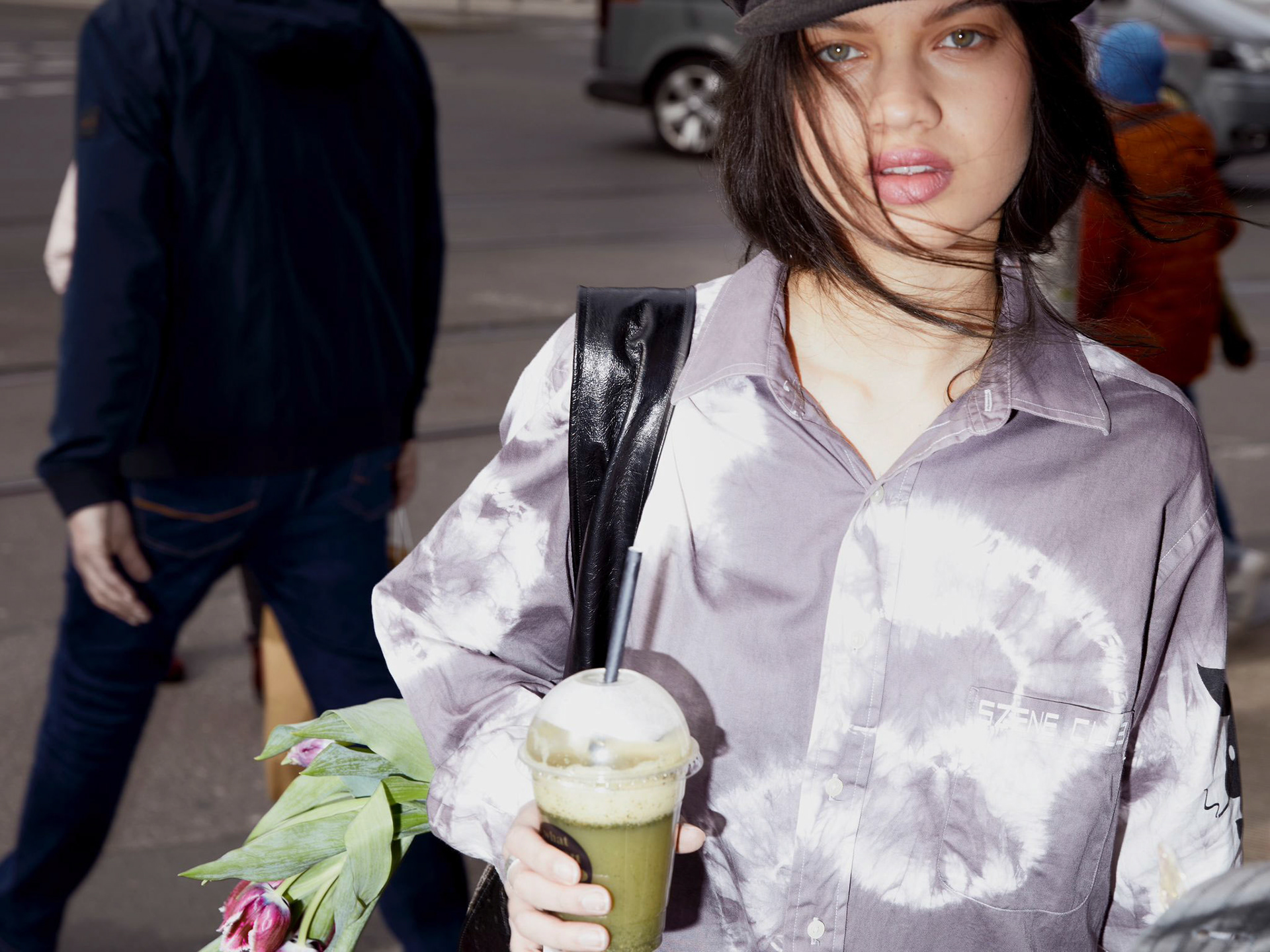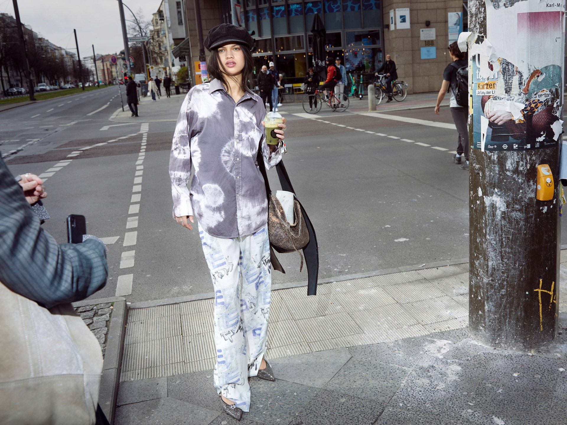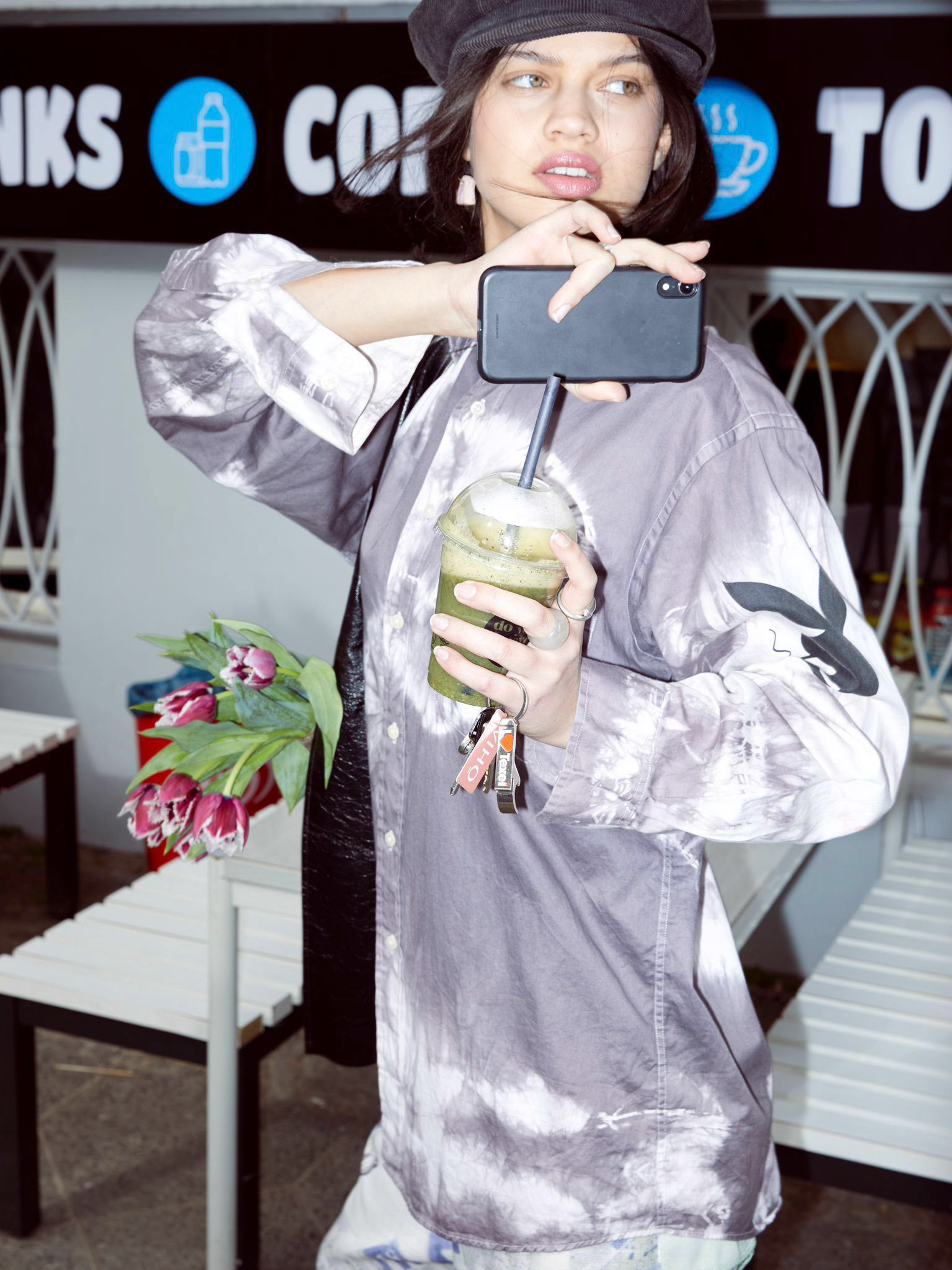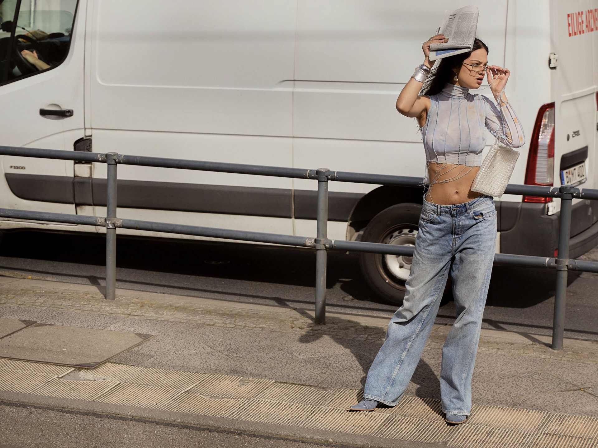 request for editorial: Different ways on how to style a shirt, Popstar day to day looks, various events, color palette: Blue - black - white - cream - shiny, mood: Paparazzi.