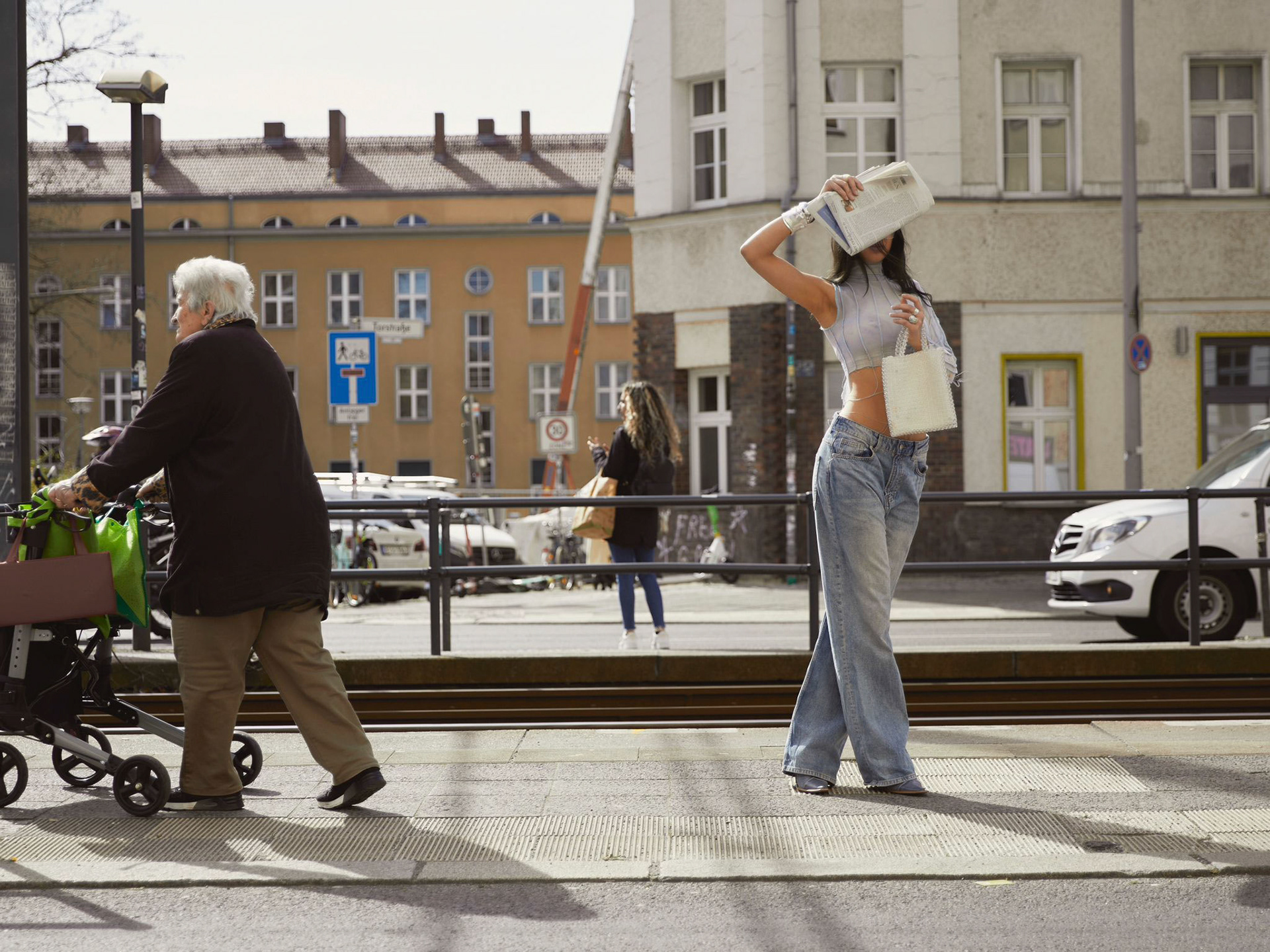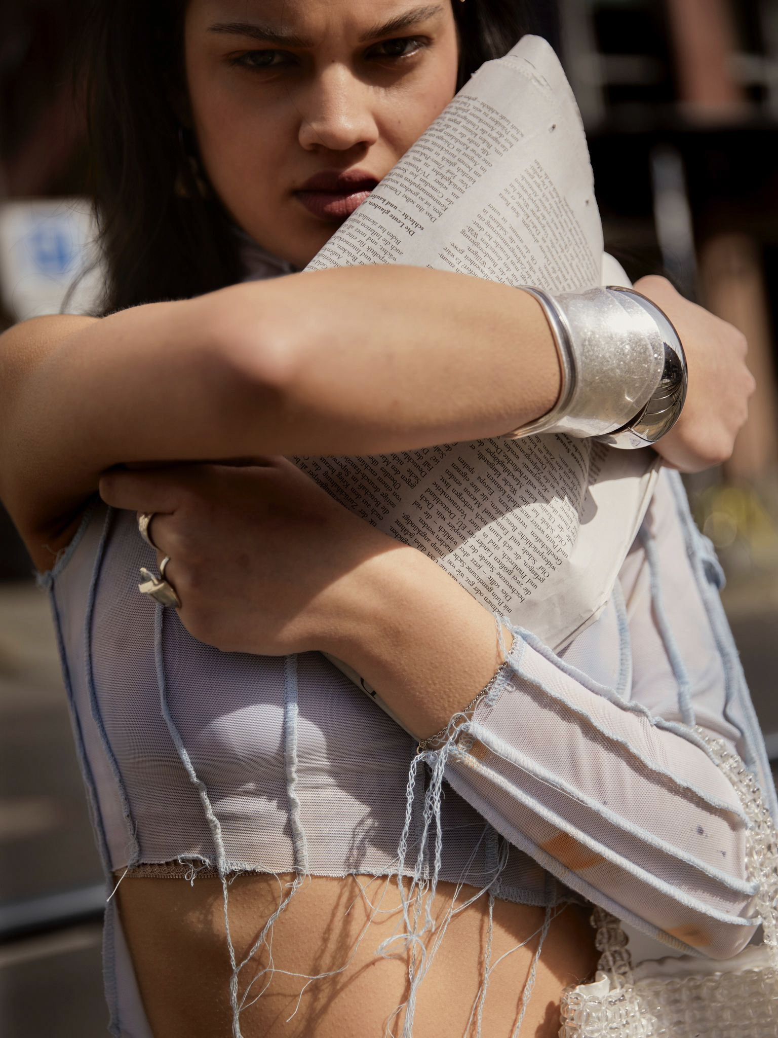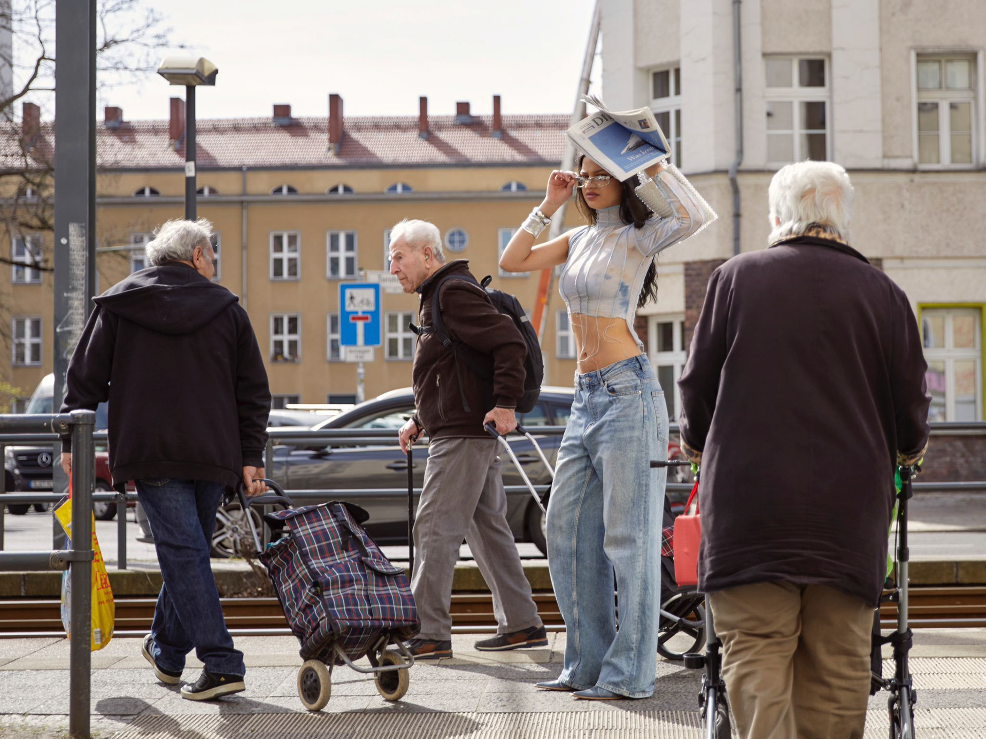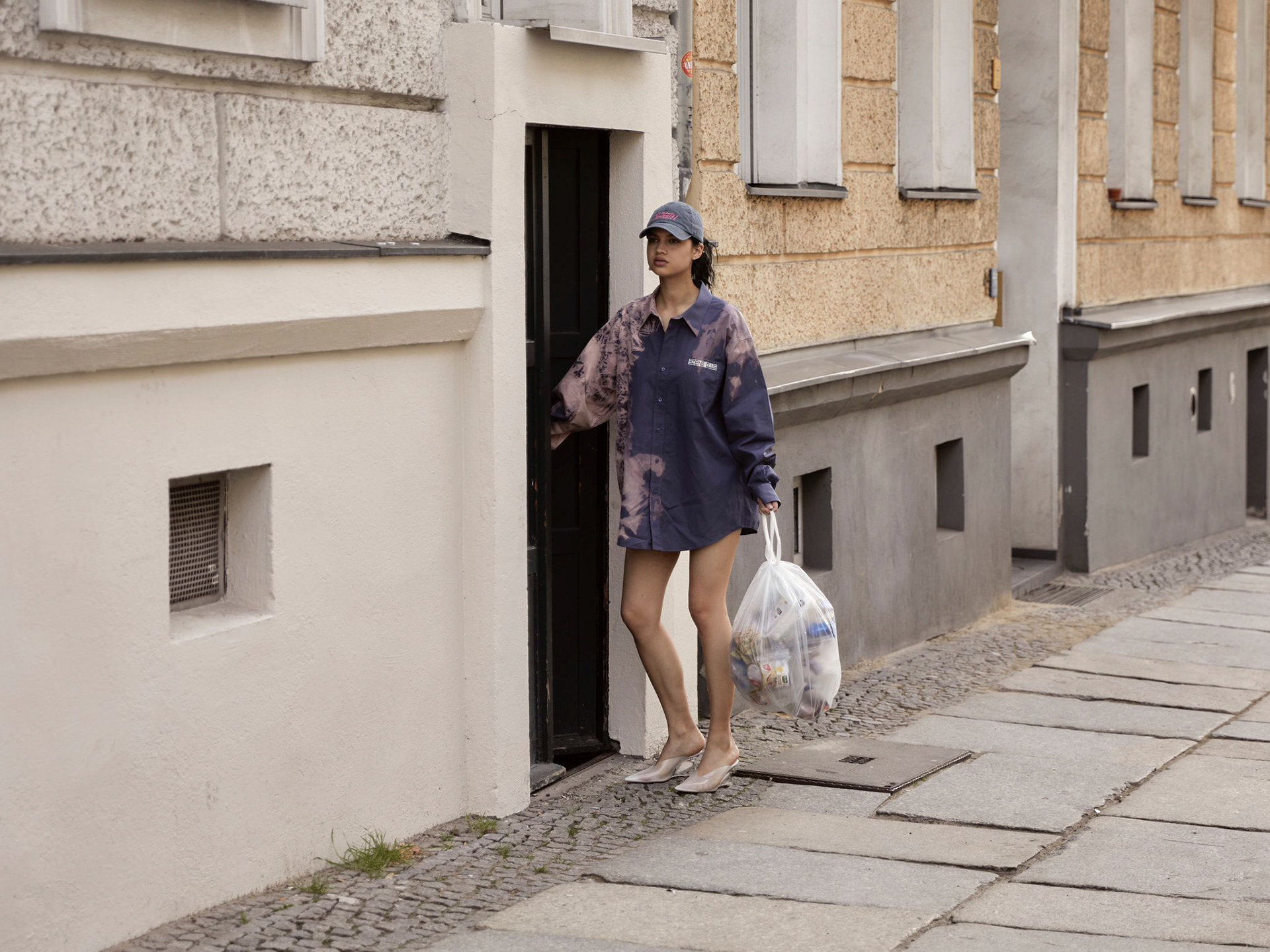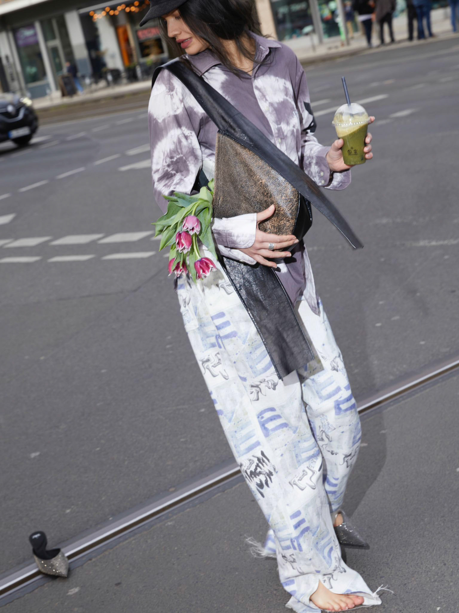 request for editorial: Different ways on how to style a shirt, Popstar day to day looks, various events, color palette: Blue - black - white - cream - shiny, mood: Paparazzi.