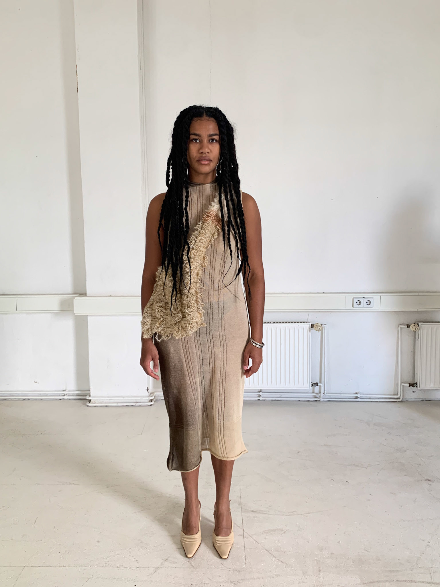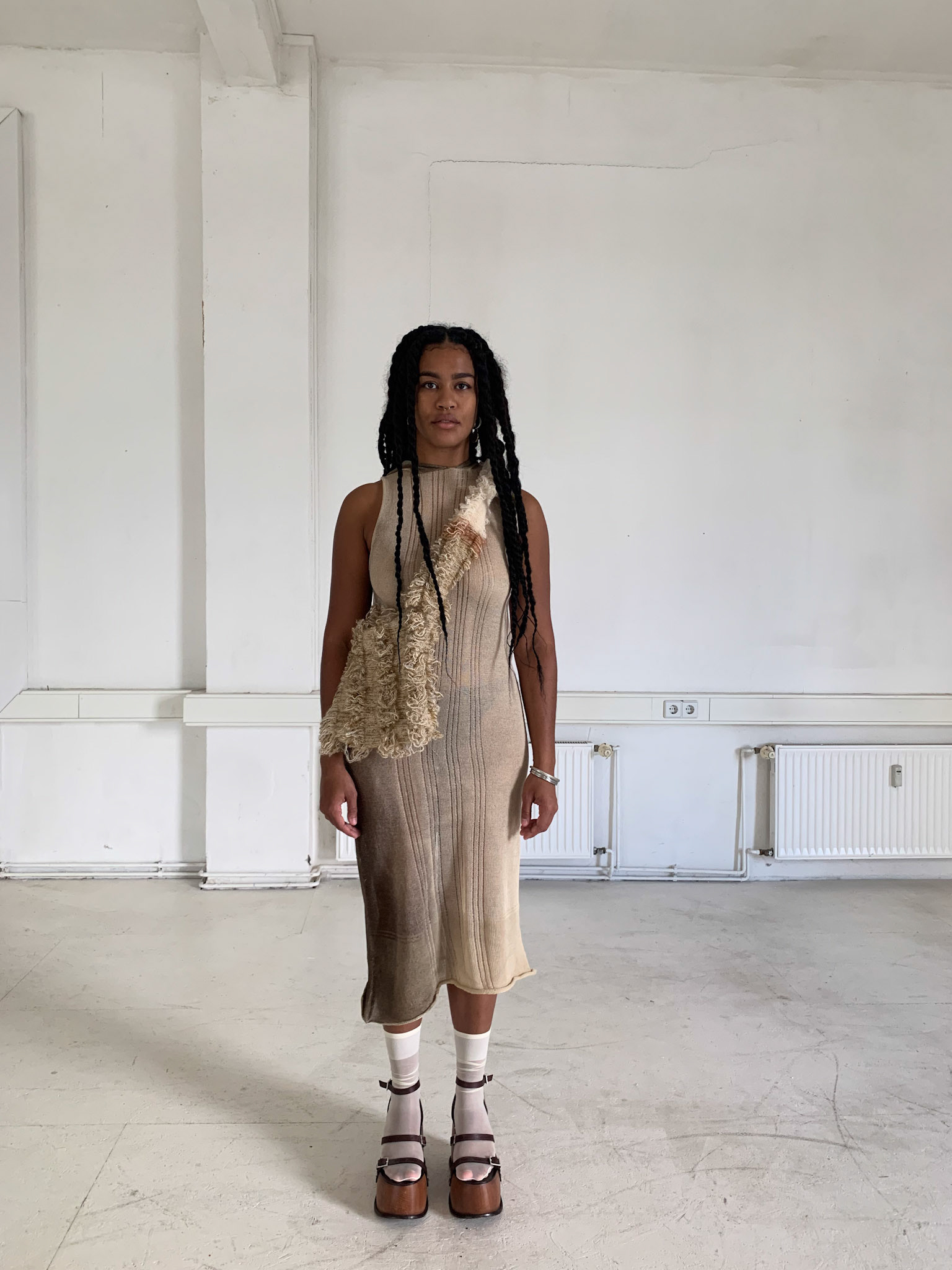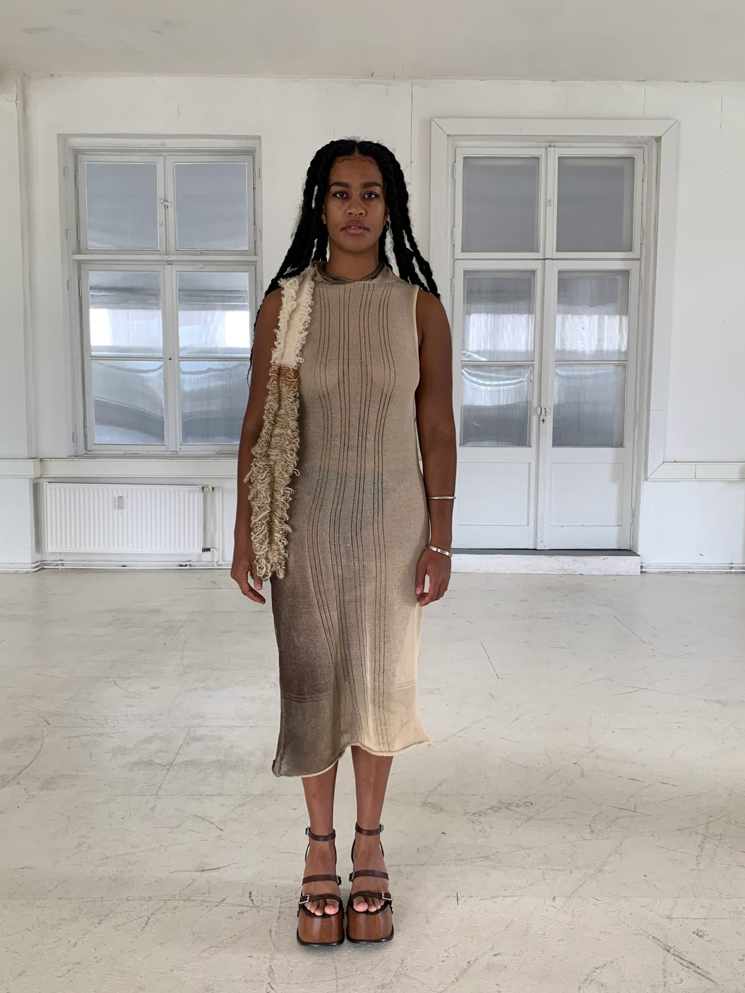 Style request for new collection: Effortless, casual, hidden, mysterious, chunky bold jewellery, various shoe options, color palette: organic - brown - beige - grey , mood: Derealisation.